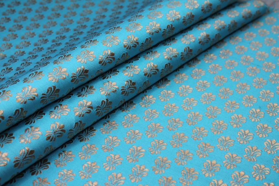 Poly-viscose mix brocade, hand loomed in India. Features a fleur-de-lys style design in turquoise and gold, no metallic thread. The design is somewhat reversible, see all images.