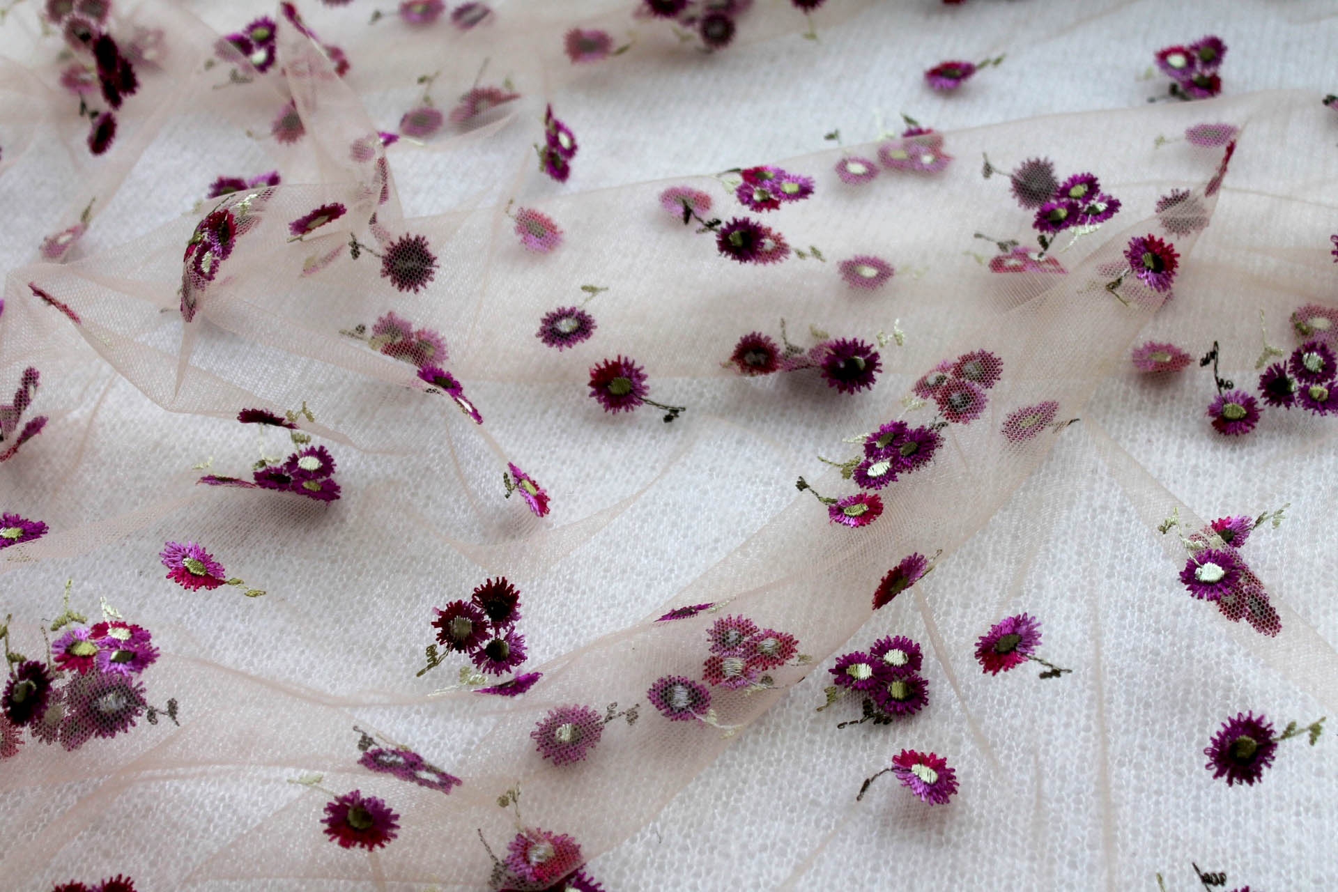 Floral Embroidered Daisies on Tulle - Pinks and Purples on Nude