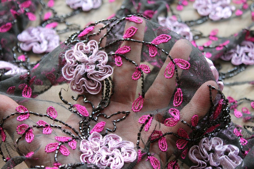 This nude tulle has pretty little scattered flowers embroidered in shades of pinks and purples with green leaves and stems.