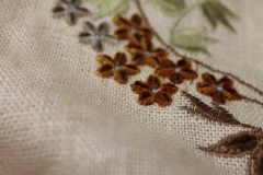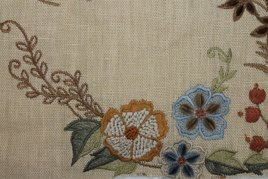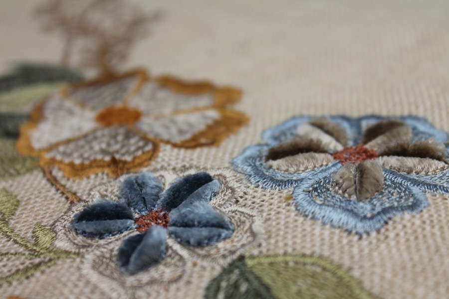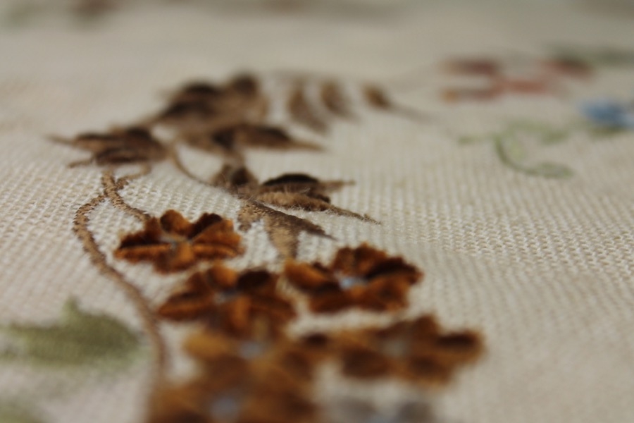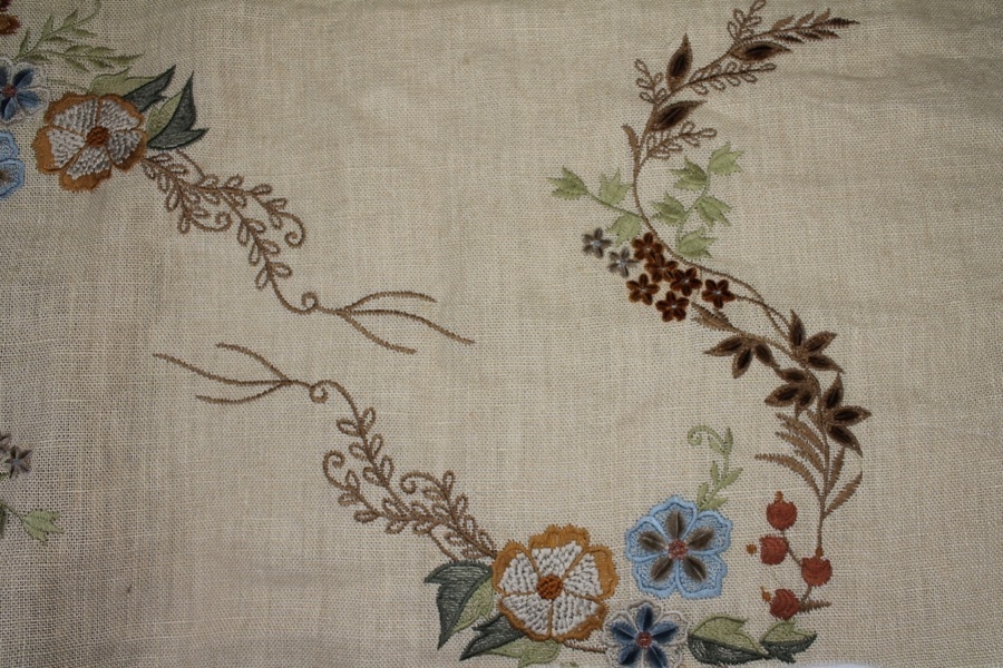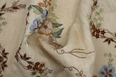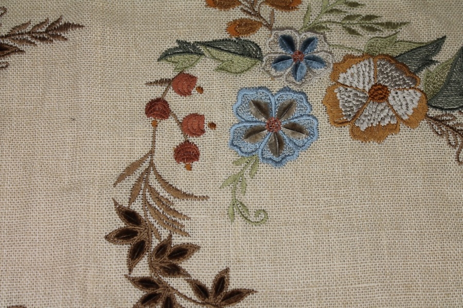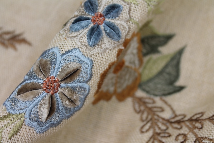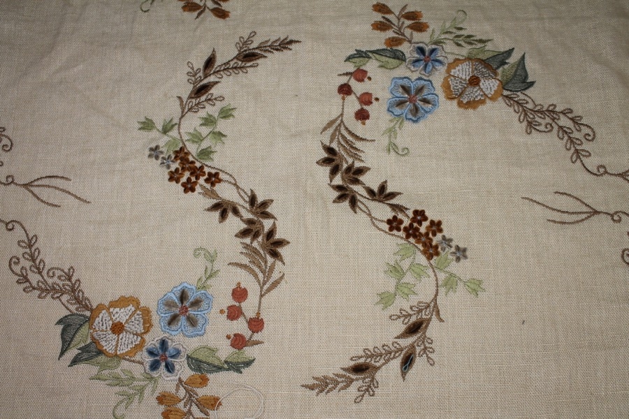 100% thick linen in cream, with a larger scale floral and twig embroidery in tones of blue, orange and greens.