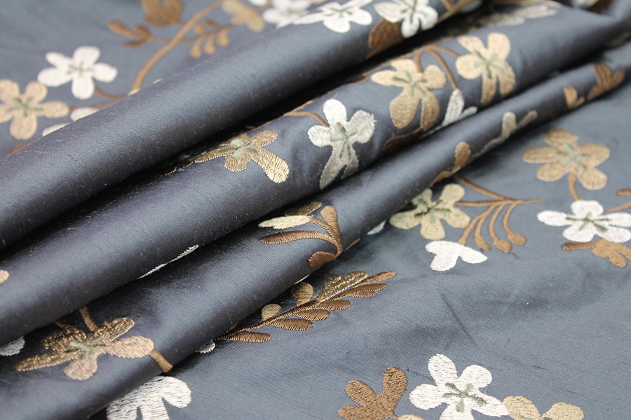 A silk dupion base in a charcoal grey, embroidered with a floral pattern in shades of mink, brown and taupe.