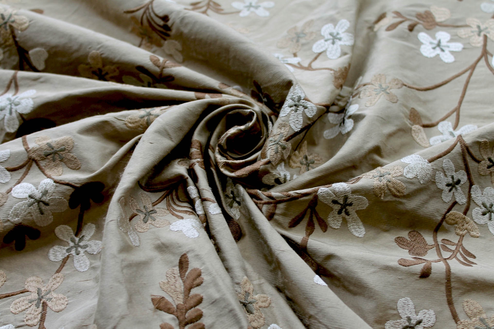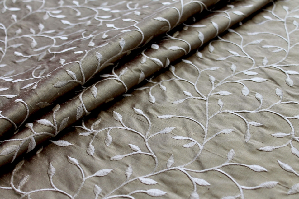 A silk dupion base in taupe, embroidered with a floral pattern in shades of mink, brown and taupe.