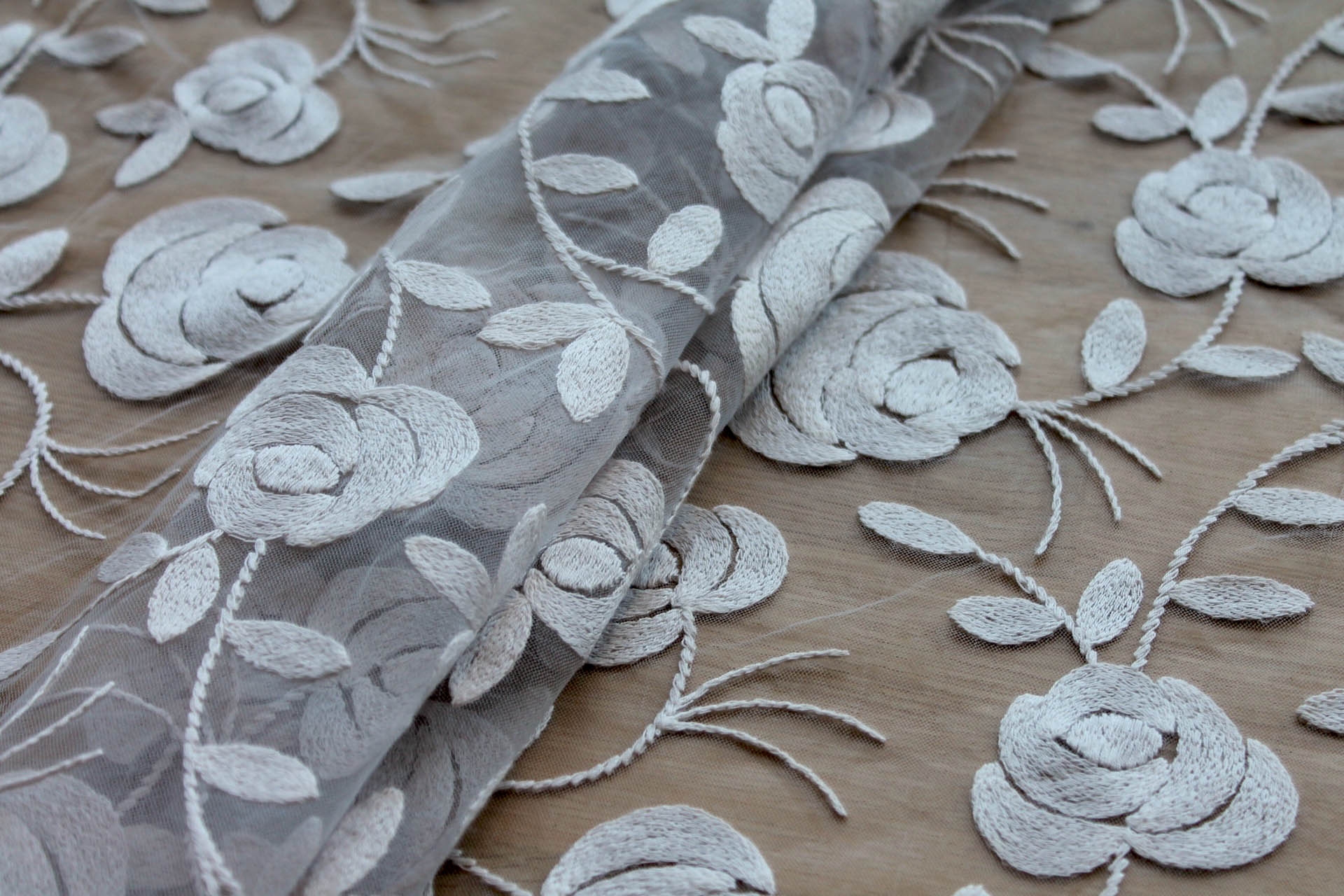 This nylon tulle has been embroidered in large stylistic flowers, leaves and vines. Pale grey in colour, 110 cm wide.