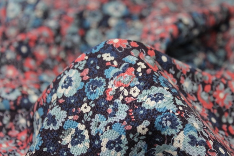 A high quality European made viscose and linen with a small scale floral print in shades of blue and deep coral on a dark coloured background. 55% Viscose 45% Linen.