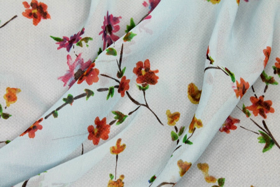 A soft silk chiffon in a pretty small scale floral print in yellow, orange, green and blue on a paler blue. 100% silk, 110cm wide.