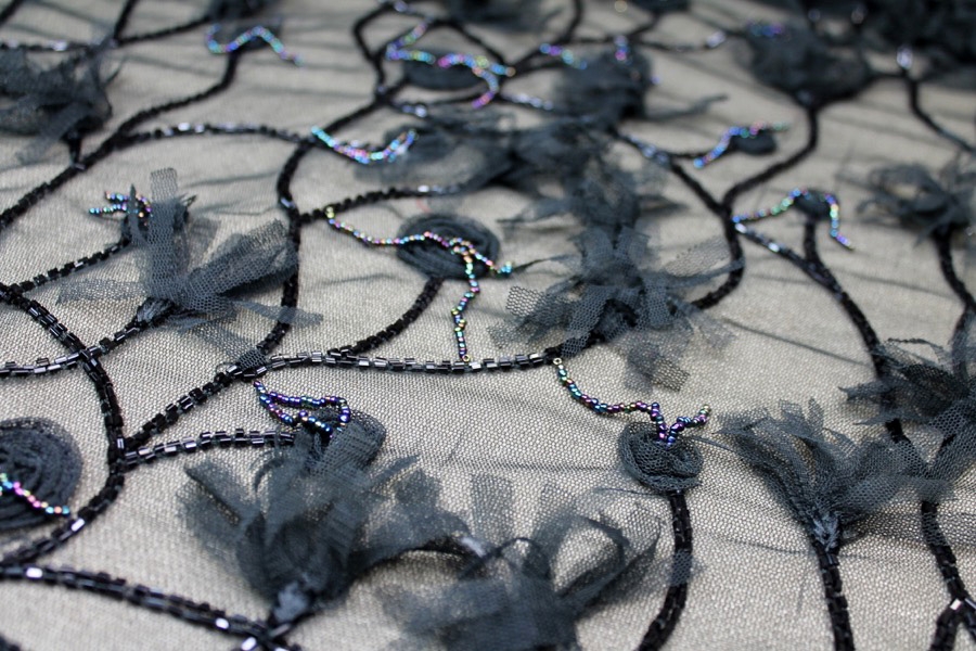Black tulle base with black bugle beads, multicoloured seed beads, tulle tassels and applique flowers.
