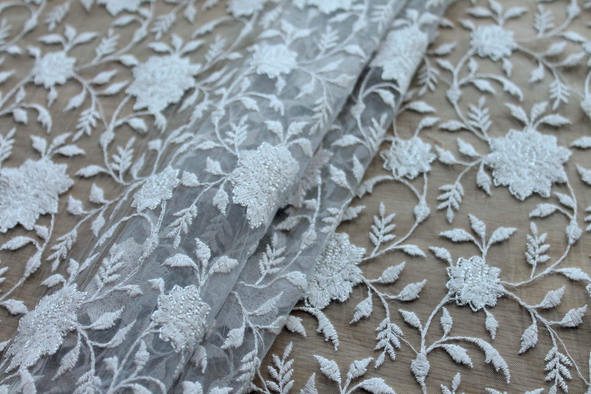 This nylon tulle has been embroidered in pretty flowers, leaves and vines. Pale grey in colour, 110 cm wide.