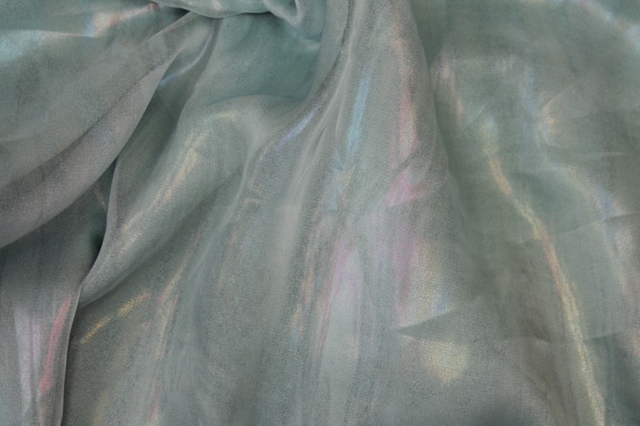 This Italian chiffon in pale pink has been foil printed in a multi coloured oil slick film, it's reminiscent of a soap bubble.