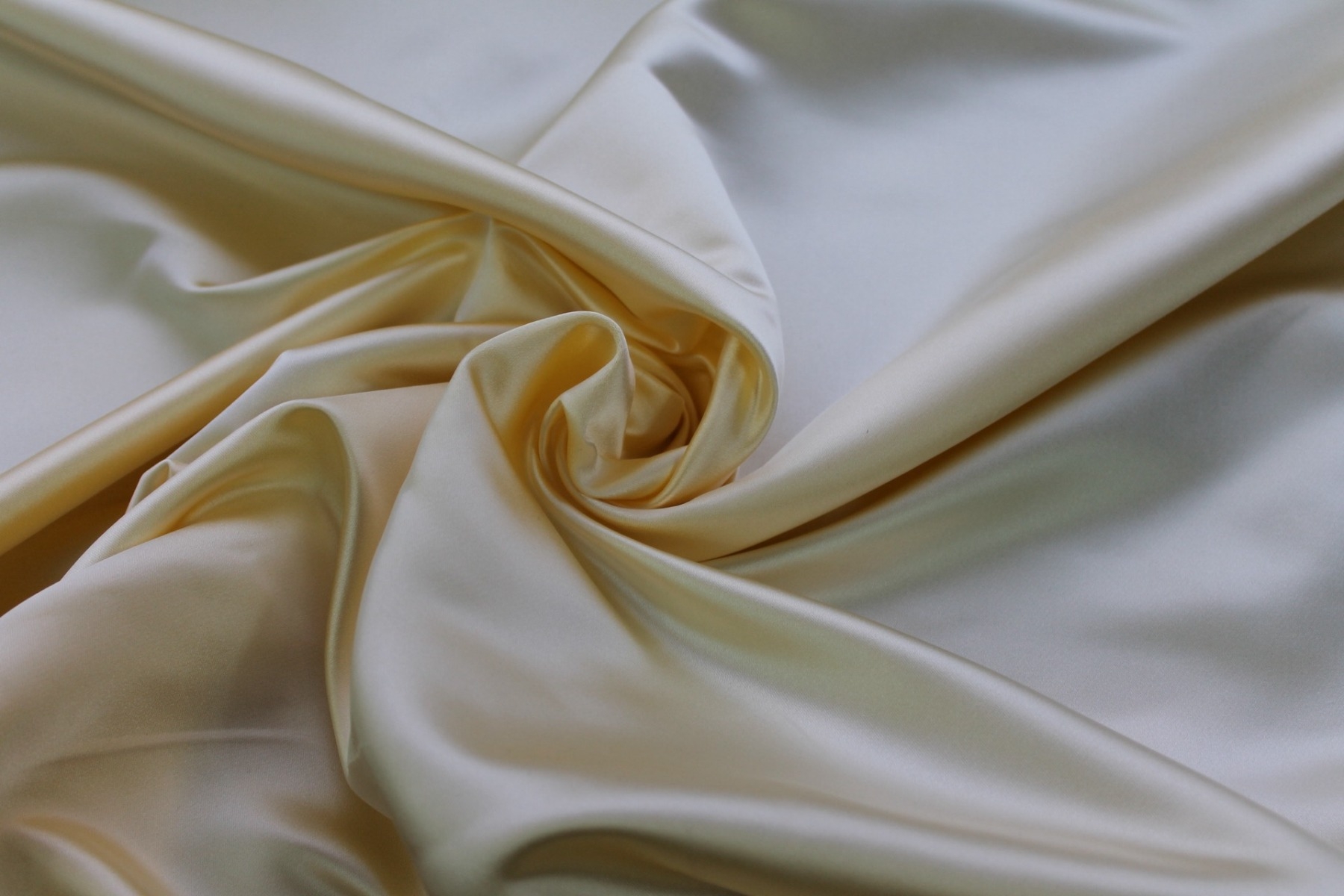 This is a beautifully supple acetate duchesse satin, woven in ivory but with a bright yellow reverse, giving it a golden sheen. Made in France. 150cm wide.