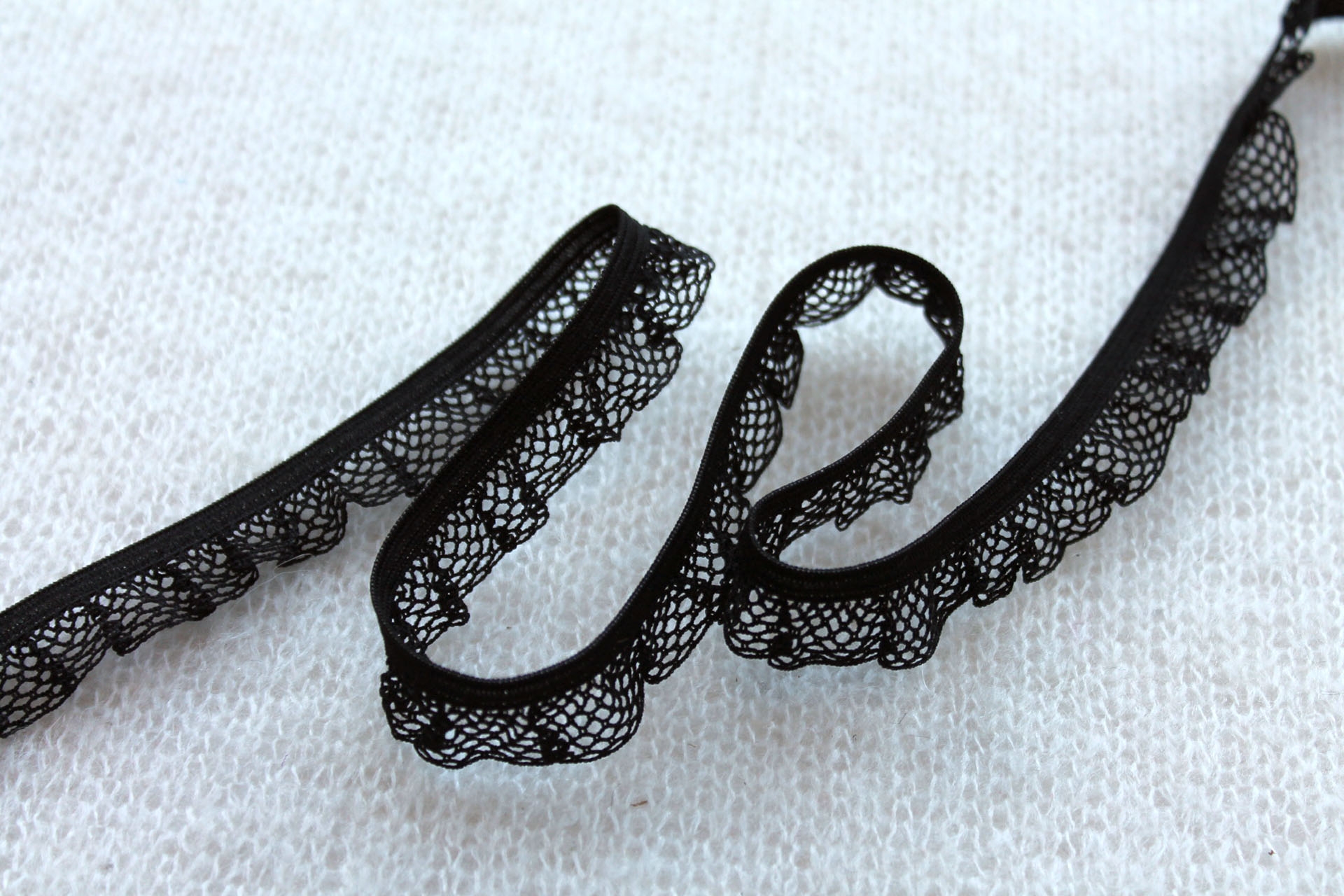 Fancy frill design elastic in black, 15mm wide. For dressmaking and lingerie.
