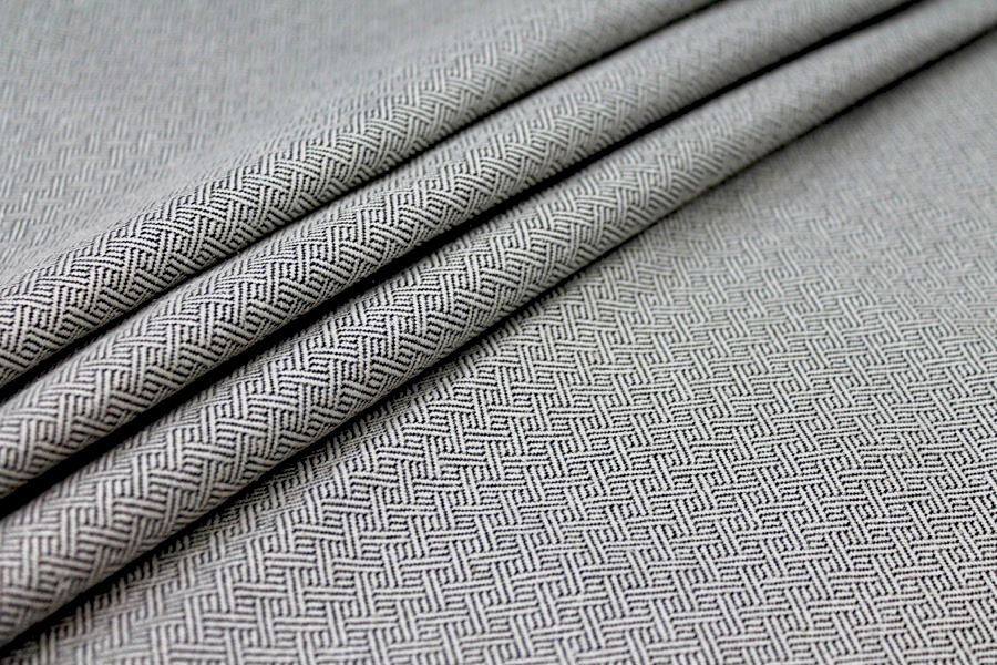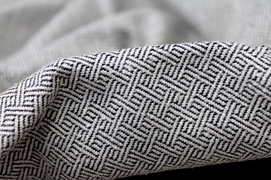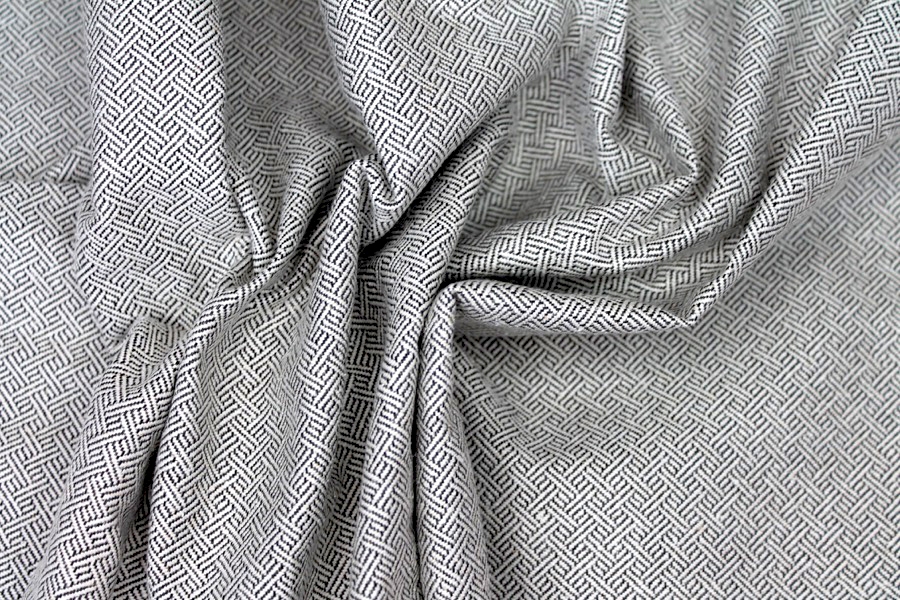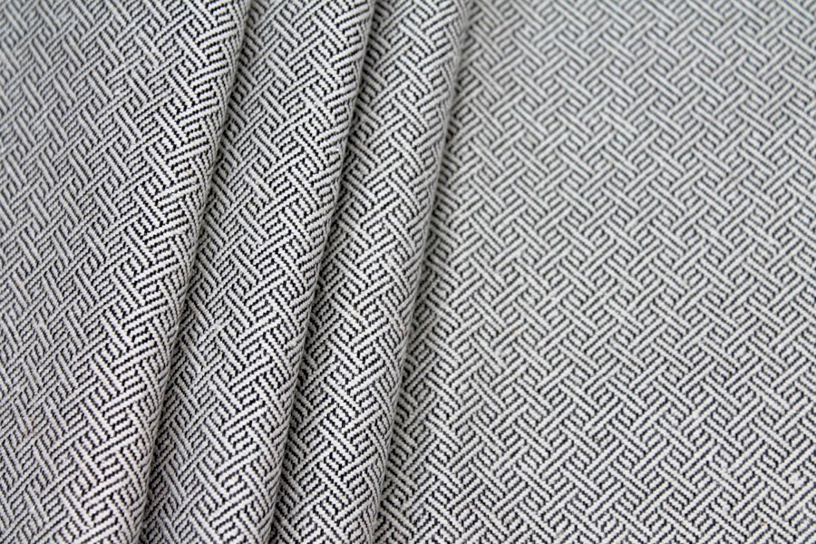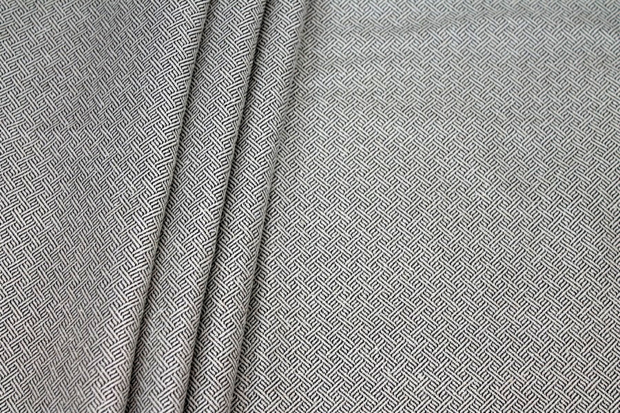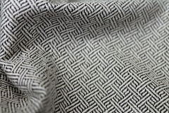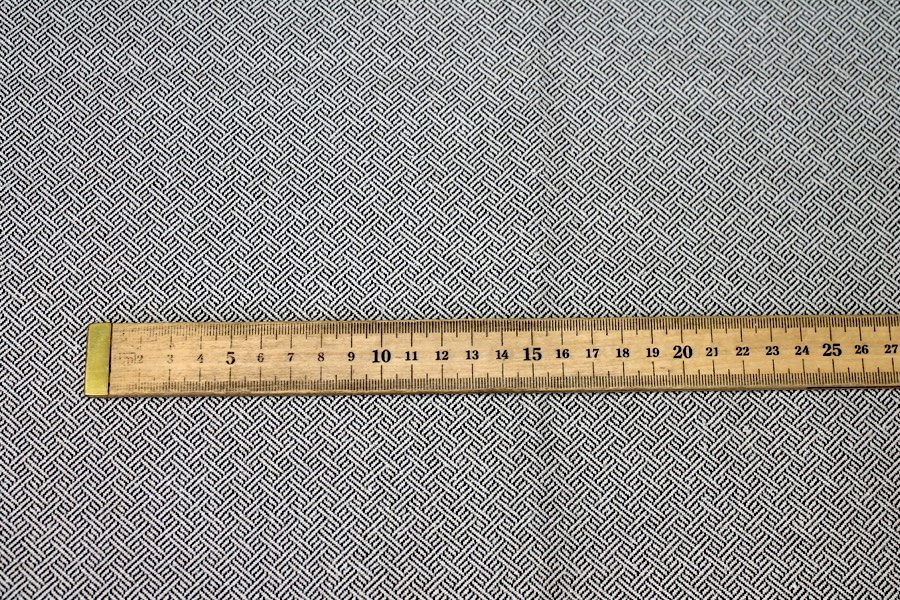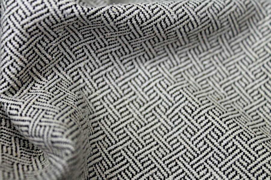 This is a simple but effective geometric trellis weave brocade in ivory and black. It is completely flat but gives the illusion of an almost 3D texture
