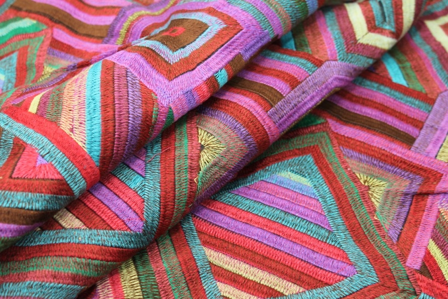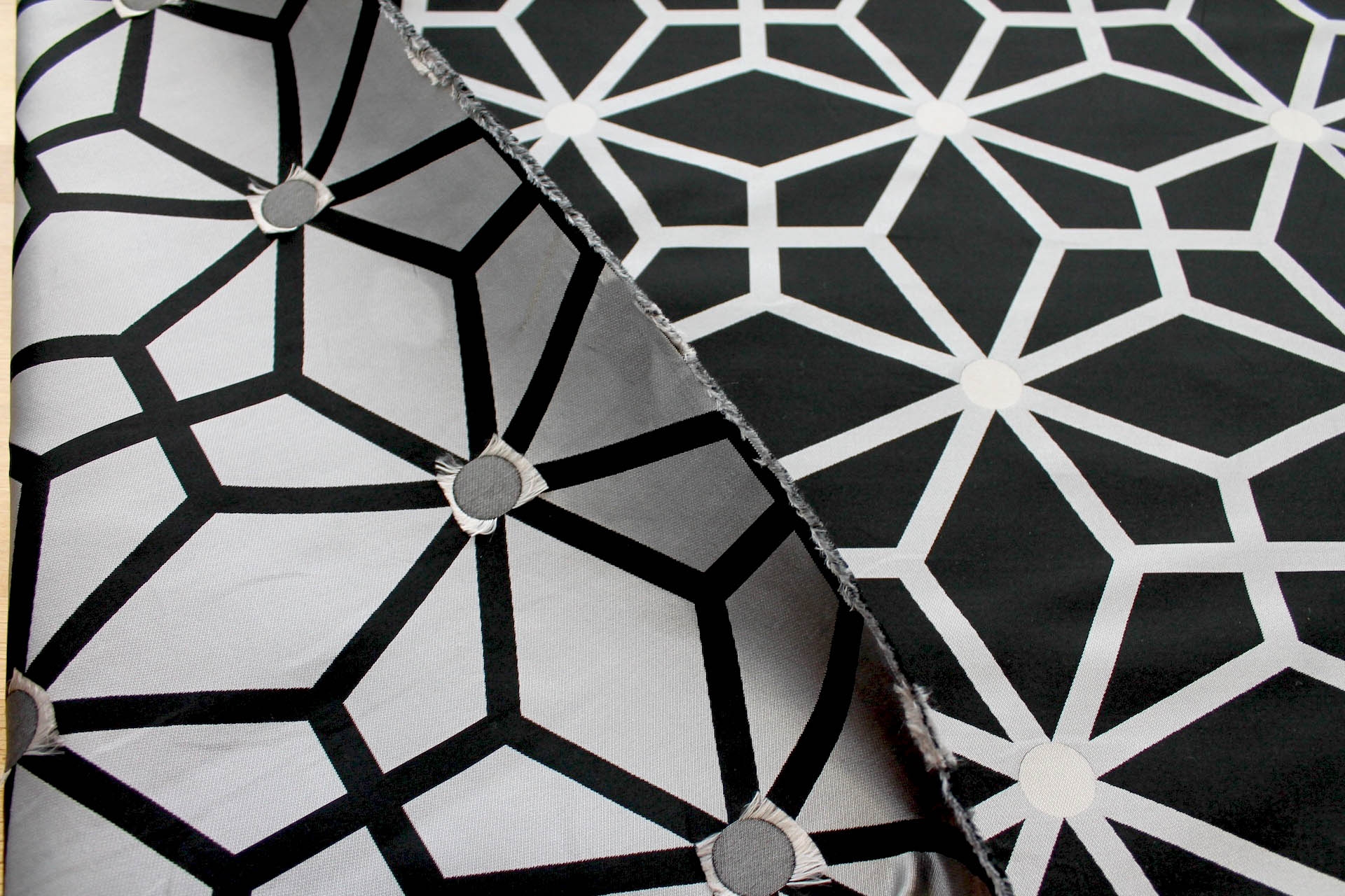 A stunning brocade in a large scale geometric pattern, woven in black with two shades of silver grey. Great for furnishings as well as fashion and costumes.