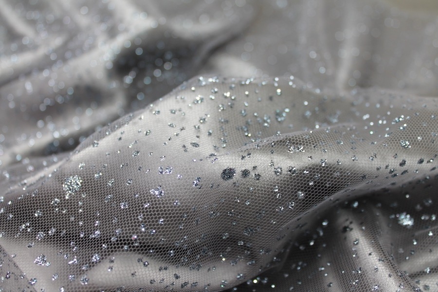 This nylon tulle is medium firm to the touch and has glitter spray spots in random sizes, great for overlaying in skirts, or for millinery.