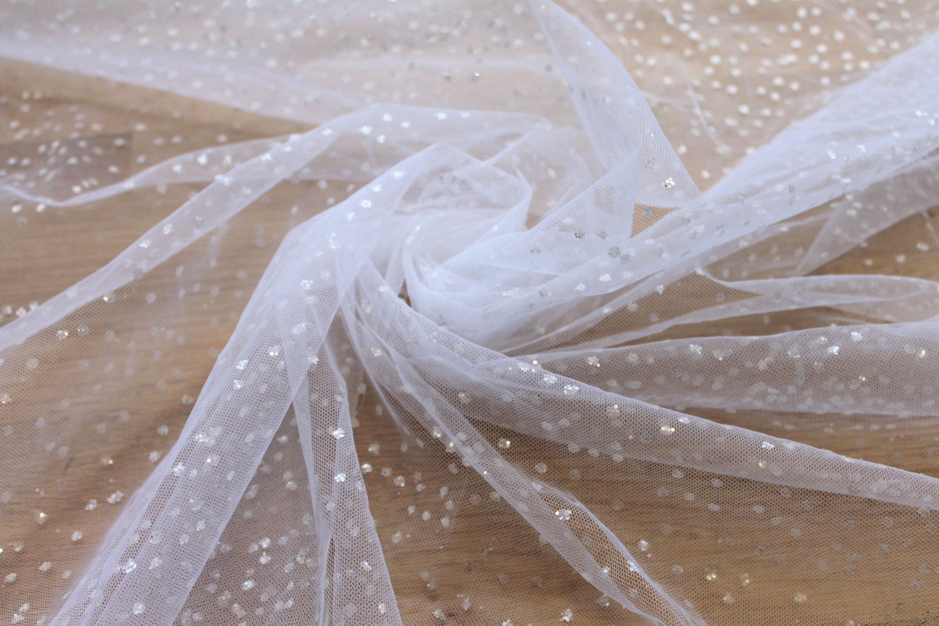 This nylon tulle is crisper to the touch and has white glitter spots in a spray pattern, great for overlaying in skirts, or for millinery.