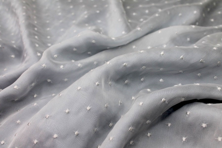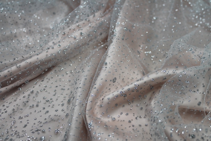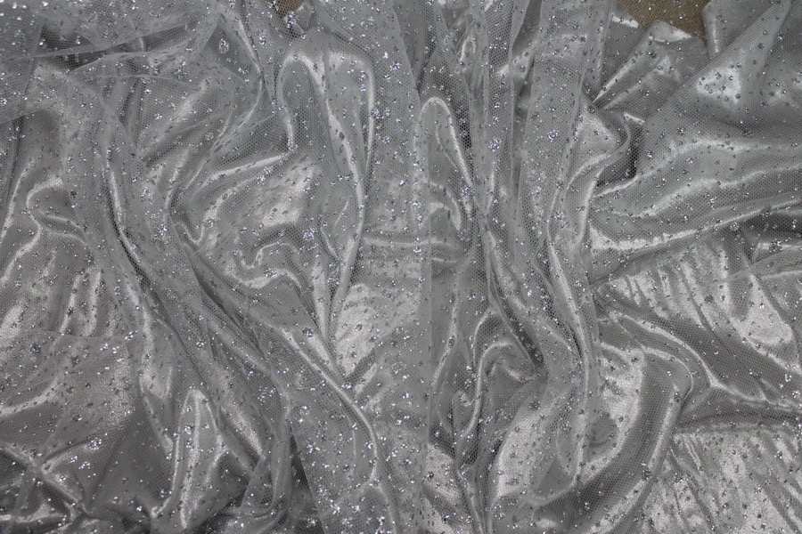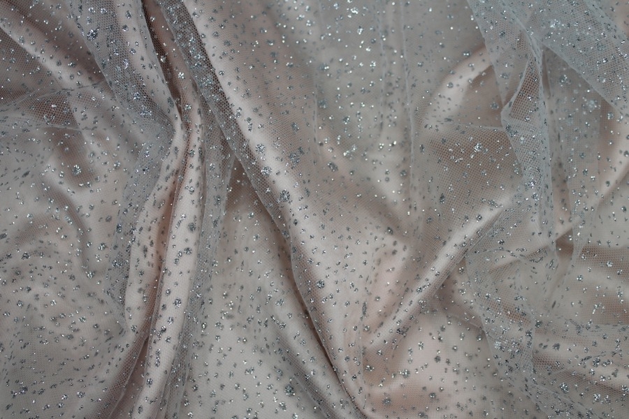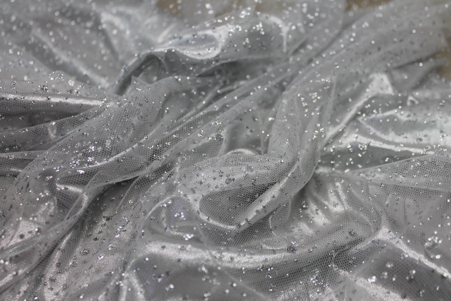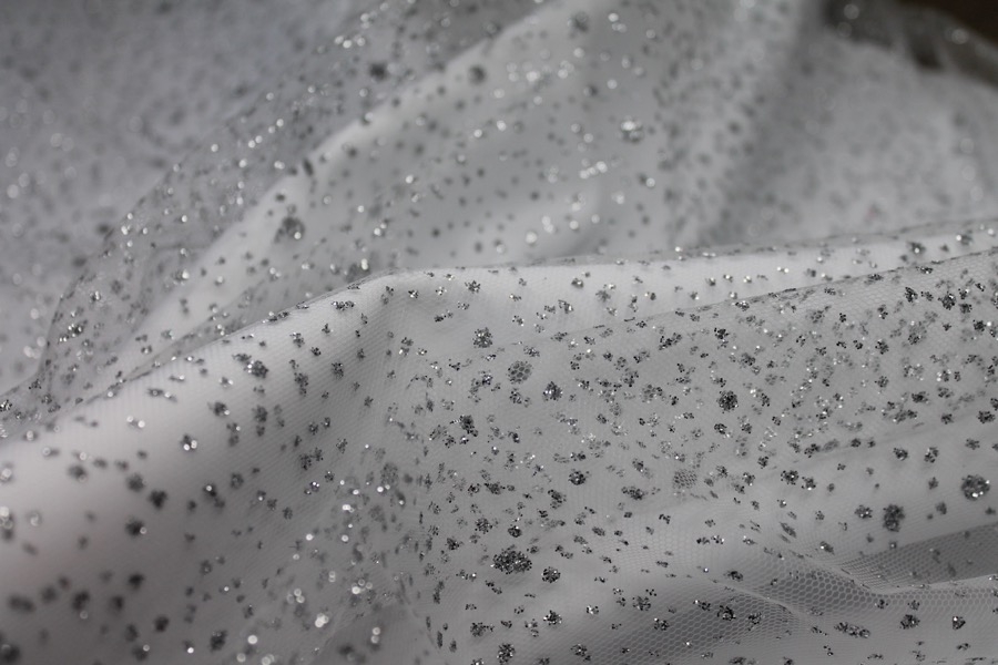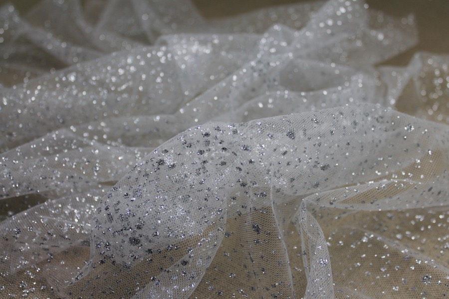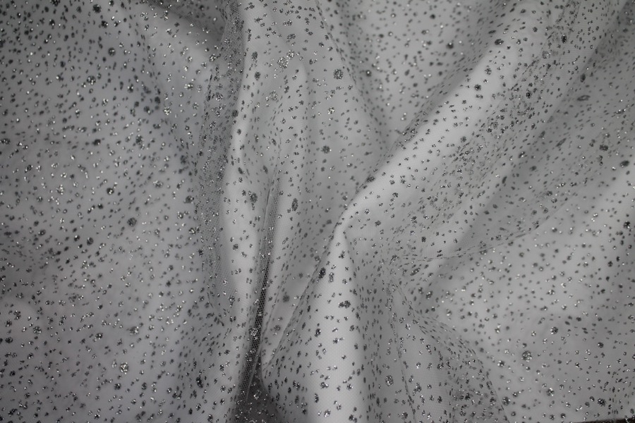 This nylon tulle is firm to the touch and has silver glitter spots in a spray pattern, great sparkly tulle for overlaying in skirts, or for millinery.