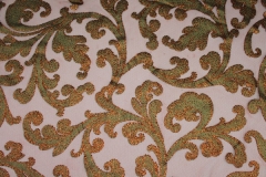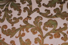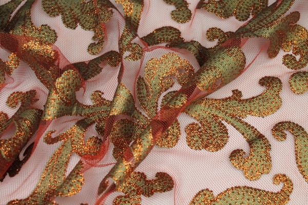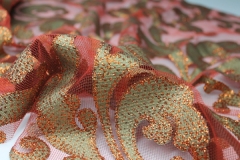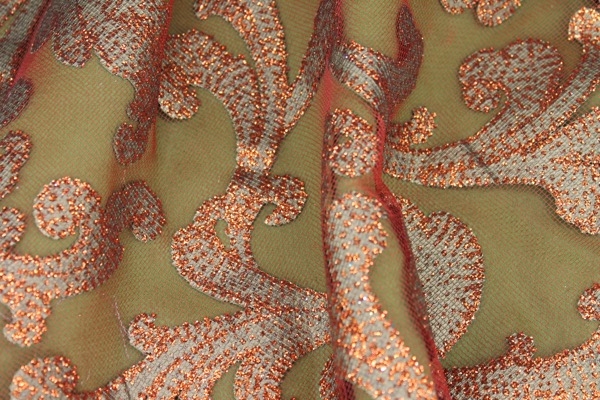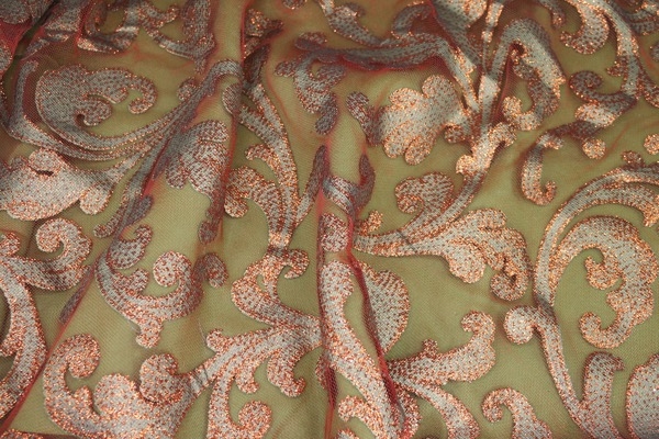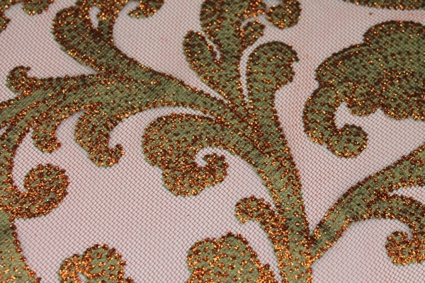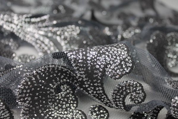 This fine nylon tulle is medium firm to the touch and has a rubberized swirl pattern printed with glitter dots, great for overlaying.