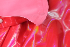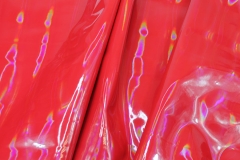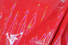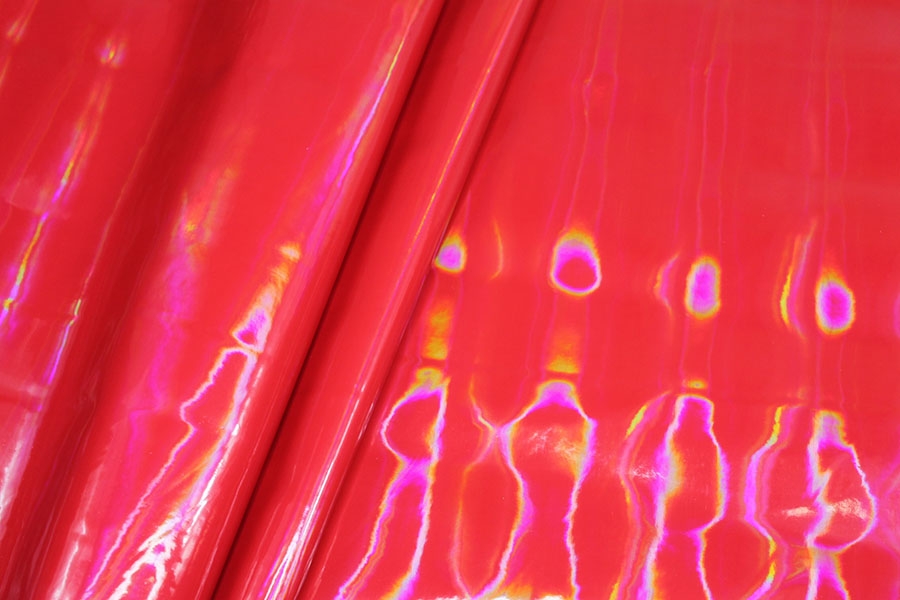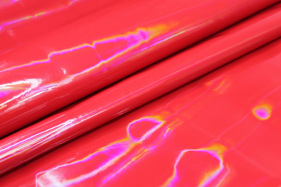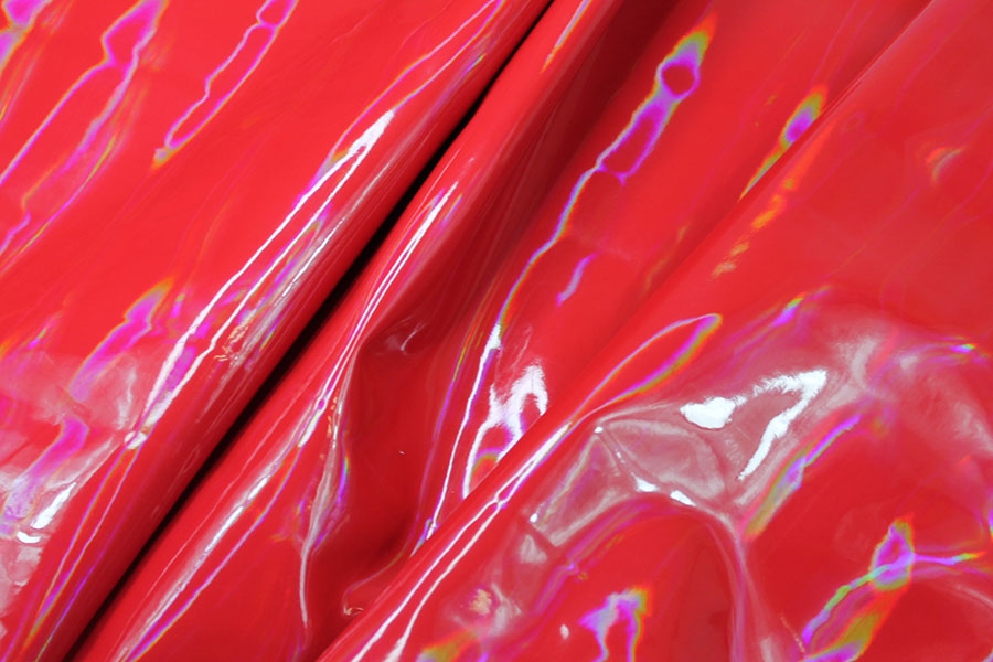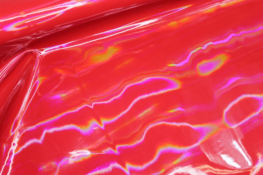 A European made glossy PVC in bright red with a holographic iridescent sheen. A nice medium weight quality.
