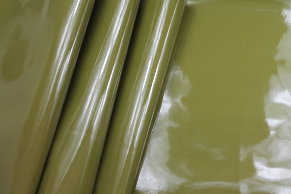 A European made glossy PVC in olive green. A nice medium weight quality.