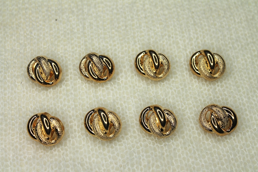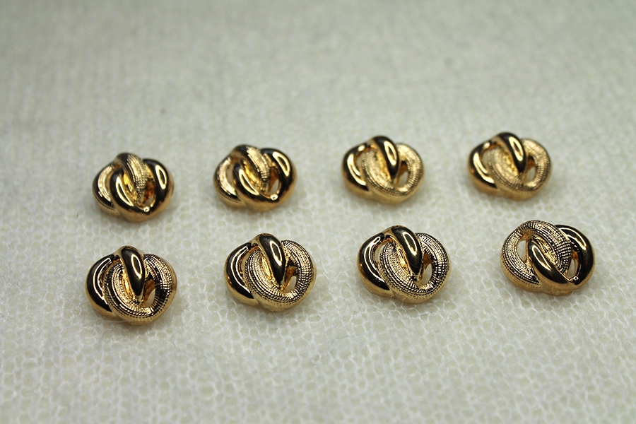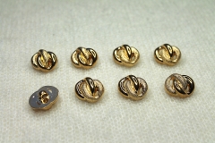 This is a vintage style shank button in gold plastic, shaped like an oval open knot. Measures about 2cm across the widest part, 1.5cm on the narrow.