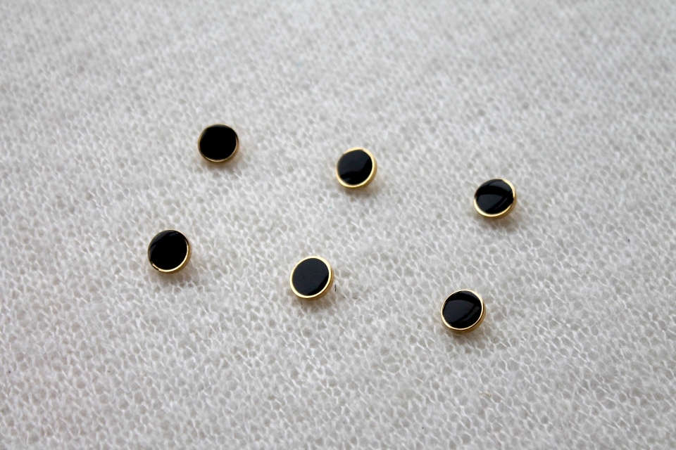 This is a vintage style shank button in gold metal with a twisted edge and black glass inlay. Measures about 1.5cm across.