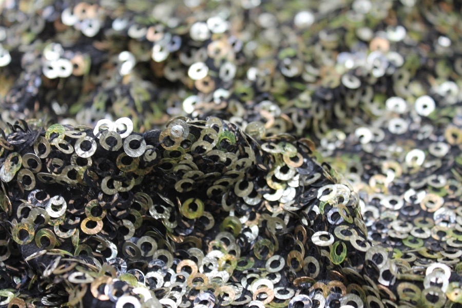 Green, Gold and Bronze Donut Sequin On Black Silk Chiffon