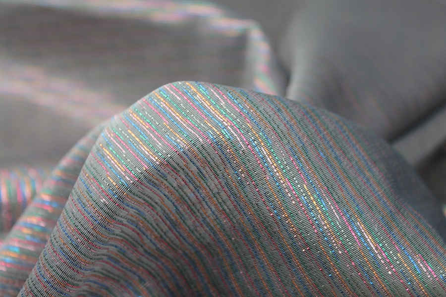 This is a grey silk organza with strands of lurex in gold, red, pink, green and blue in lines from selvedge to selvedge, the rainbow coloured lurex makes the grey silk appear almost lilac in tone.
