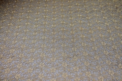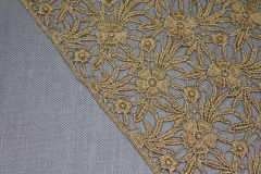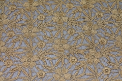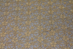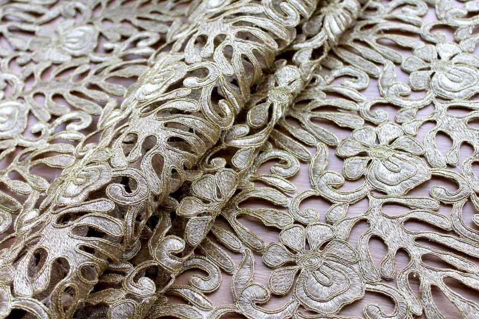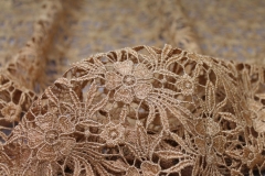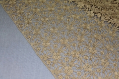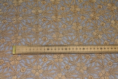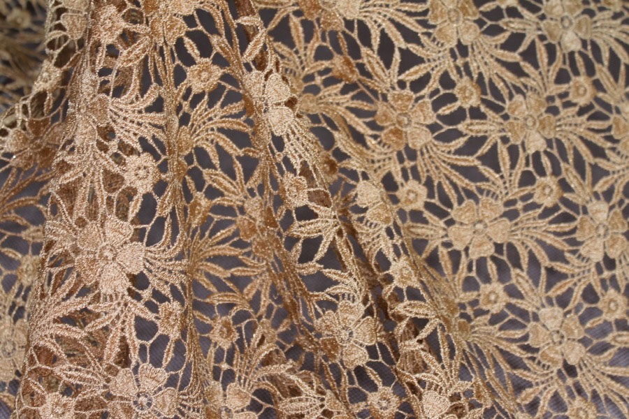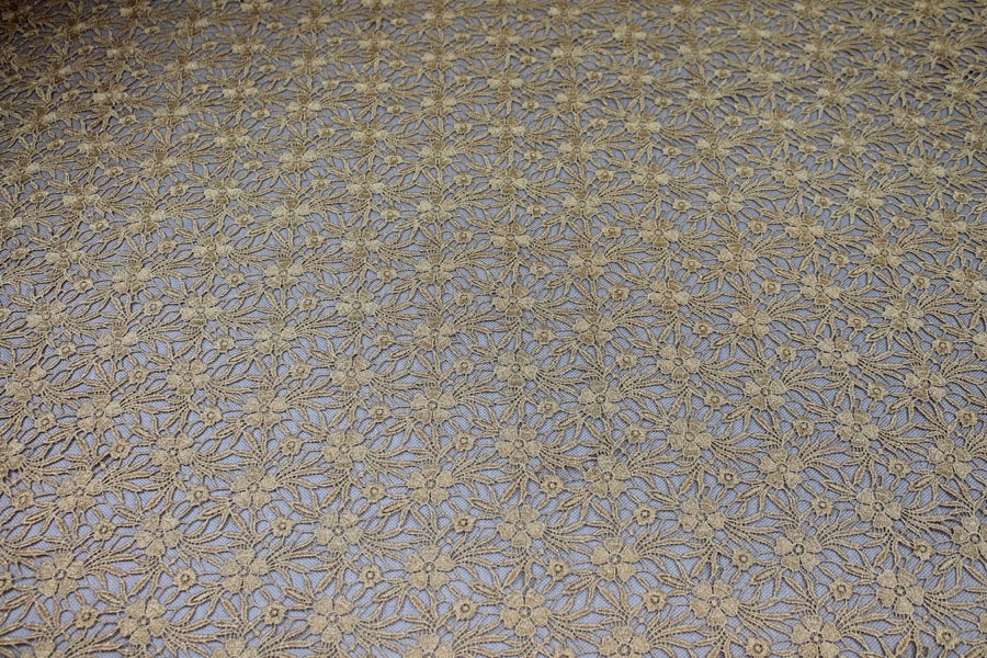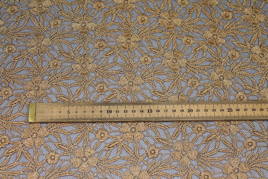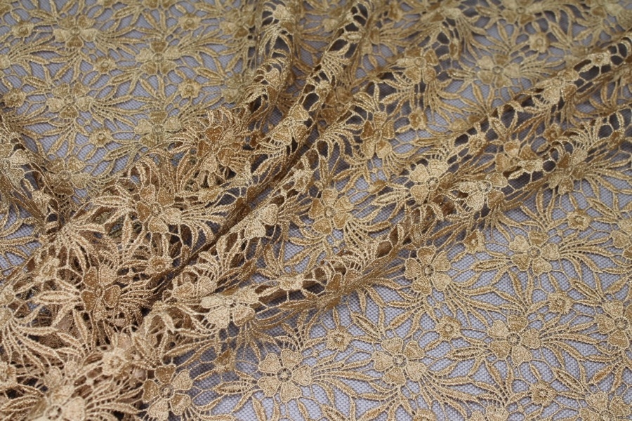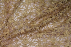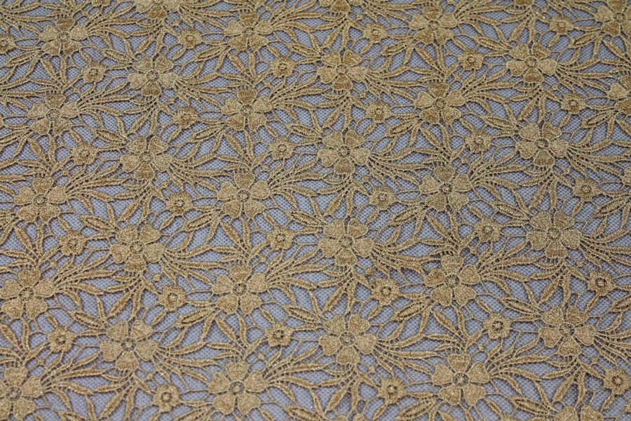A beautiful French Guipure lace in a floral pattern resembling daisies, in a metallic warm gold colour, double scallop.