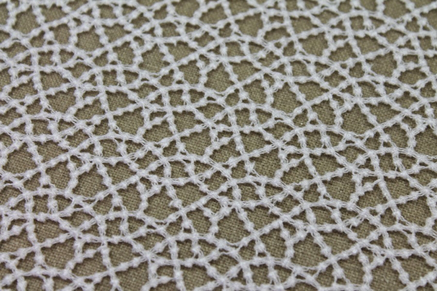 A modern Guipure lace in a spot/dot pattern, in ivory, with a straight scallop.
