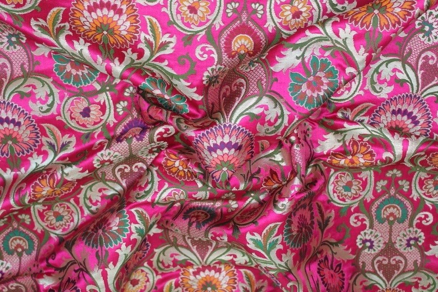 100% silk, heavy weight brocade made using a deep magenta pink for the base and multi coloured silk threads and metallic gold threads.