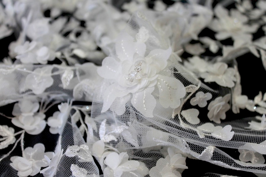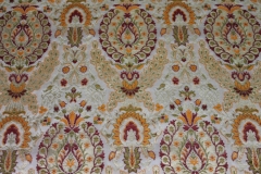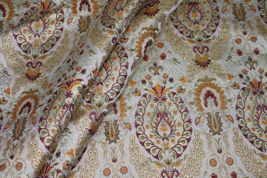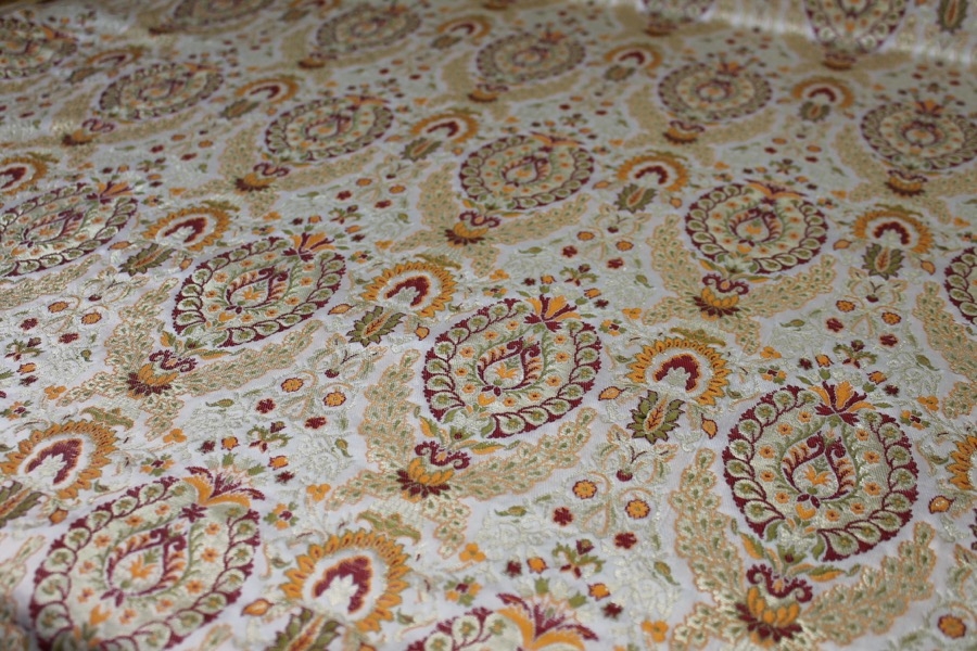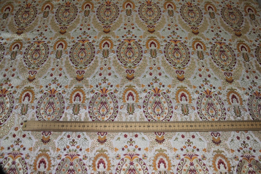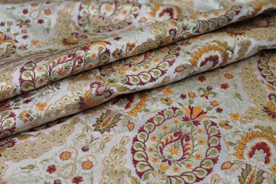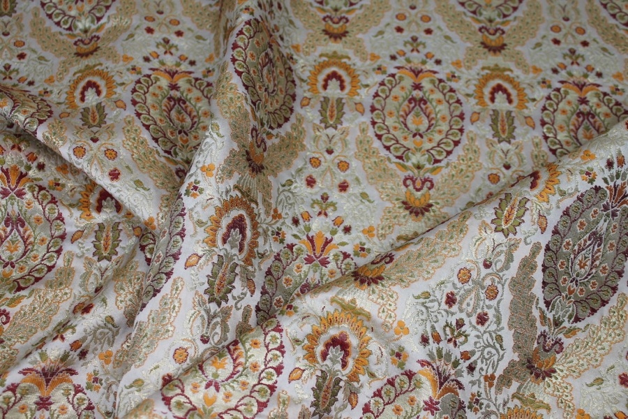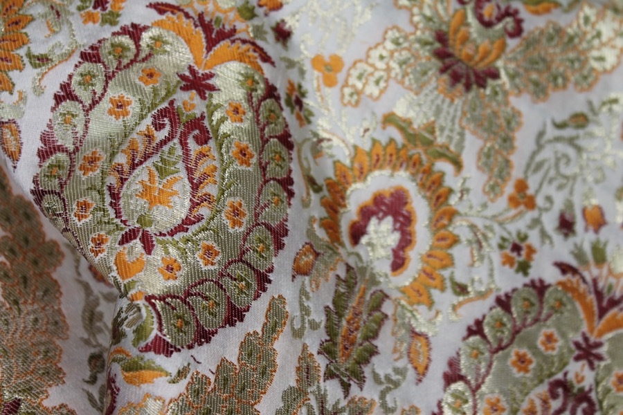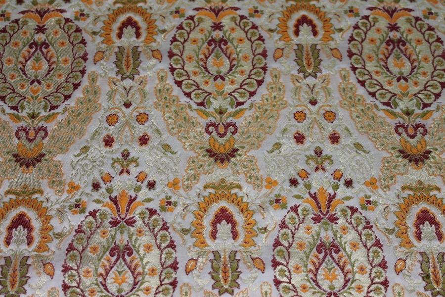 100% silk, heavy weight brocade made using silk threads and metallic gold threads, resulting in a multicoloured floral pattern on an ivory ground. Green and gold leaves, flowers in orange, red, and green.