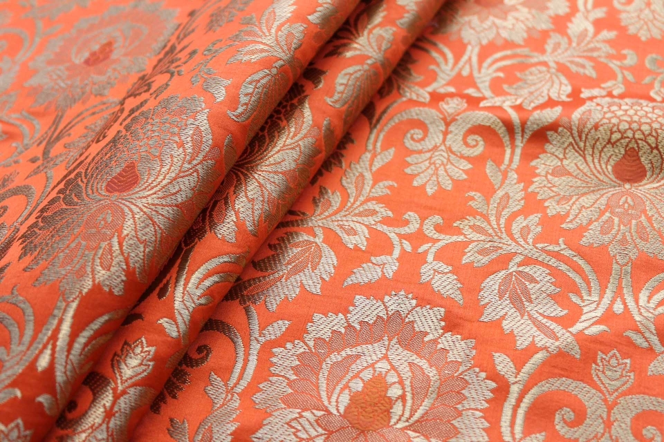 100% silk, heavy weight brocade made using silk threads and metallic gold threads, resulting in a multicoloured floral pattern on an ivory ground.