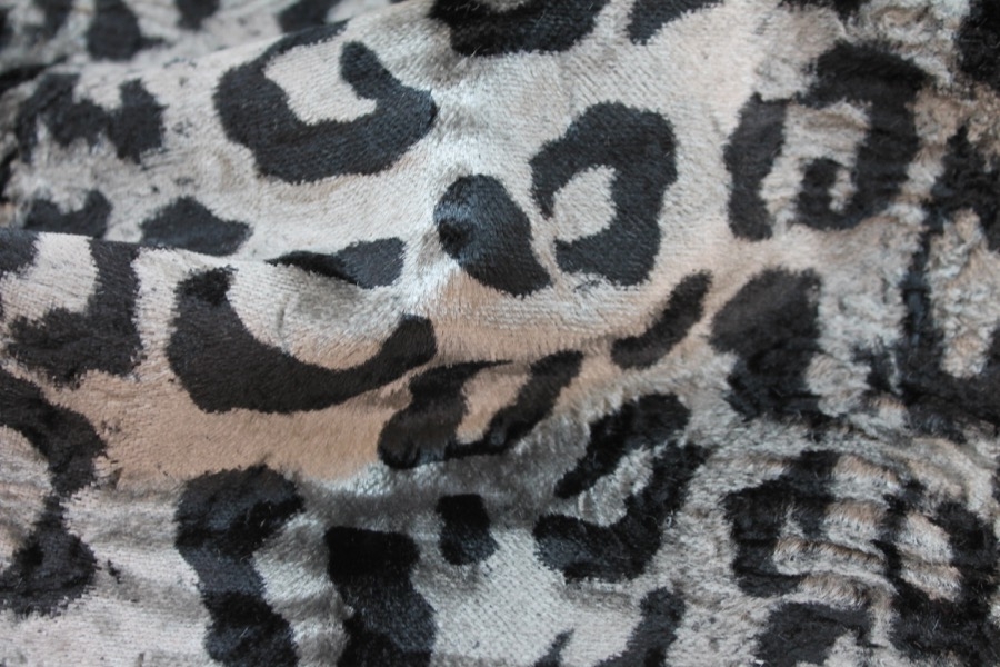This is a heavy Italian cotton velvet in grey with black leopard spots. Similar to a very short pile faux fur, approximately 2-3mm depth. Woven cotton back.