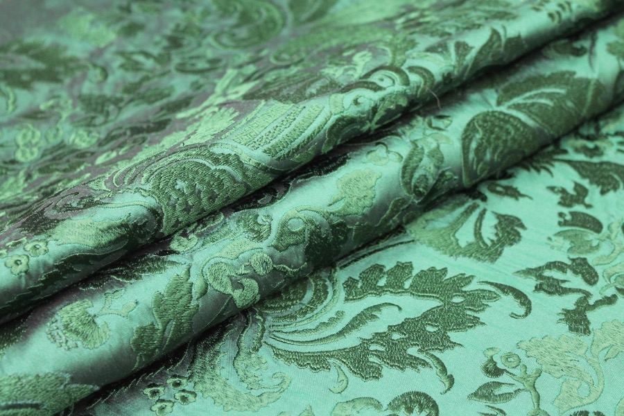 A beautiful silk dupion base in emerald green shot black with a detailed jacquard style embroidery in a matching green.