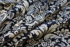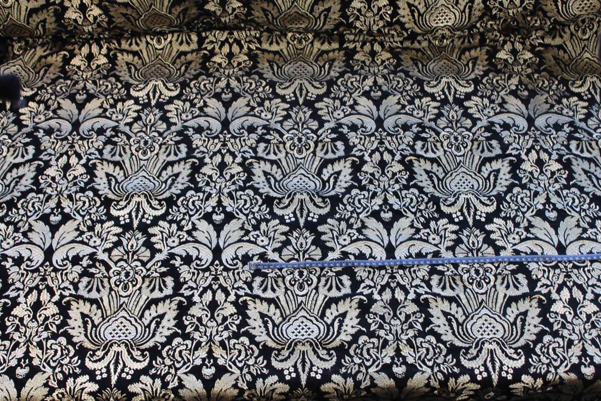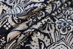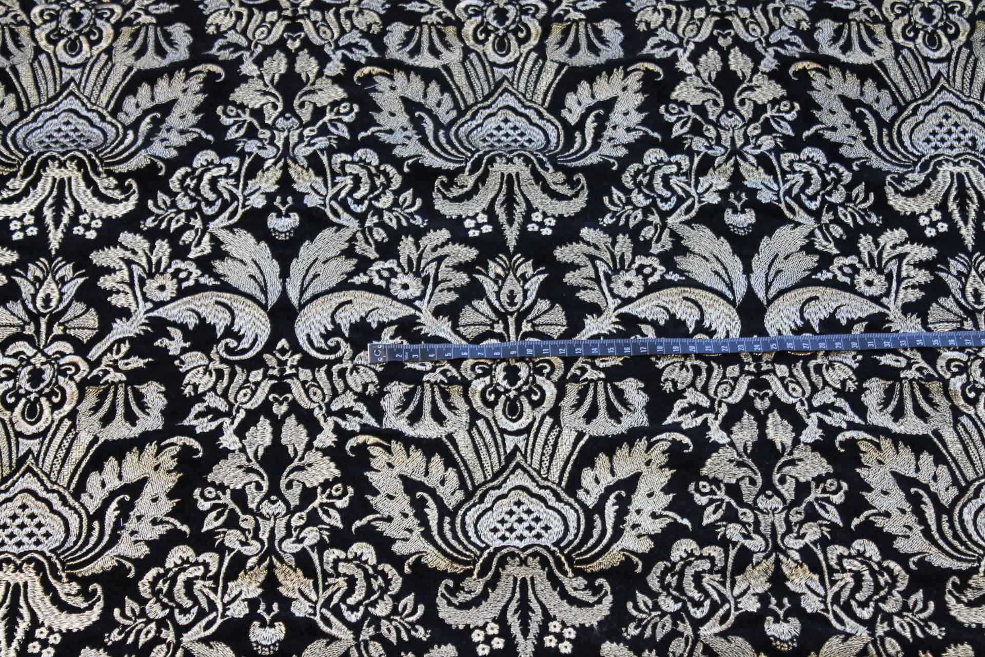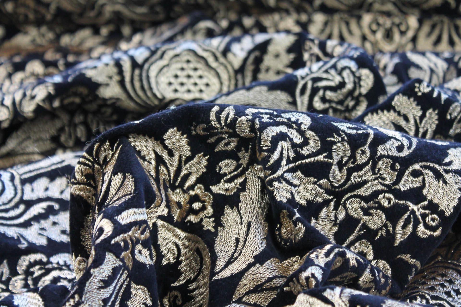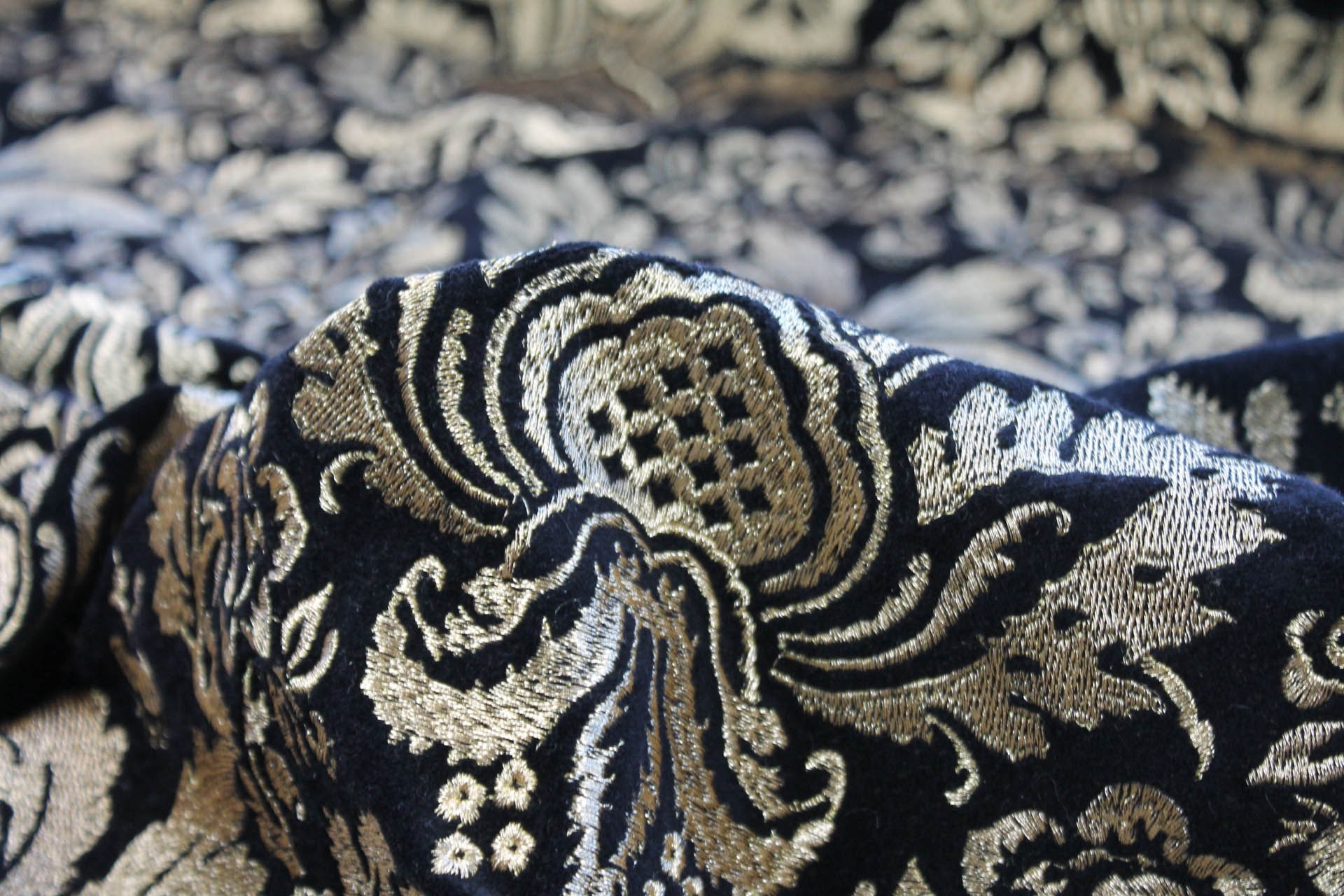 A beautiful cotton velvet base in black with a detailed jacquard style embroidery in metallic gold.