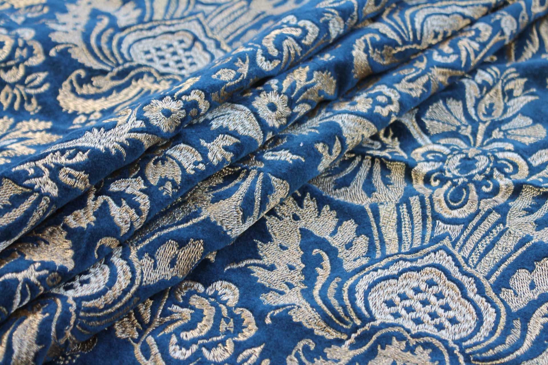 A beautiful cotton velvet base in a deep blueish teal with a detailed jacquard style embroidery in metallic gold.