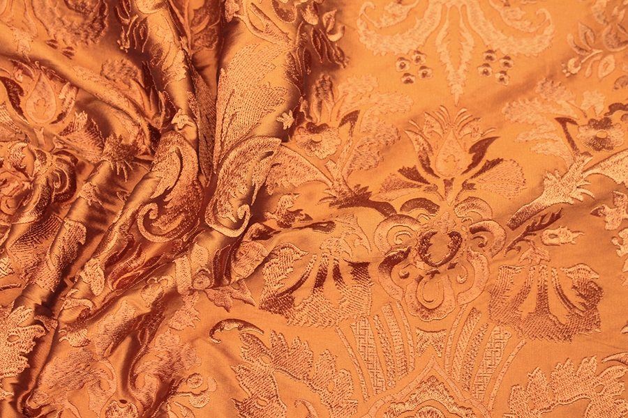 A beautiful polyester dupion base in orange with a detailed jacquard style embroidery in a matching orange. Wider width at 140cm.