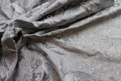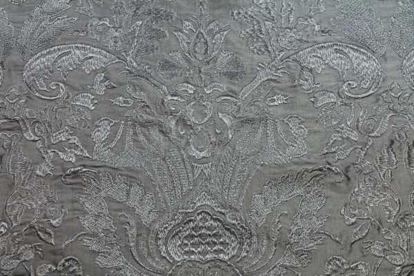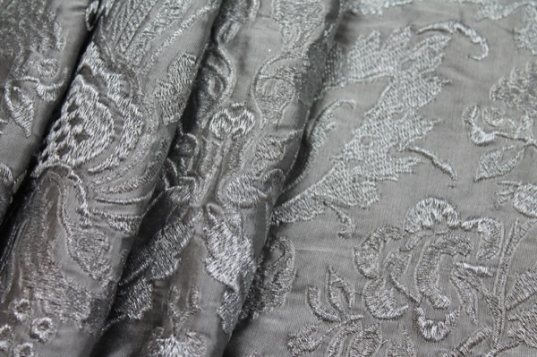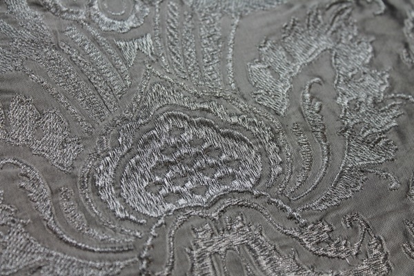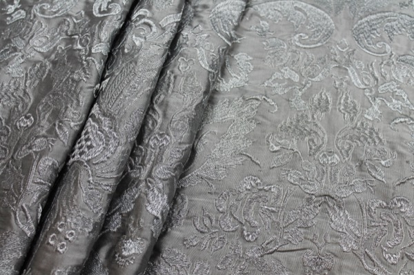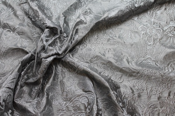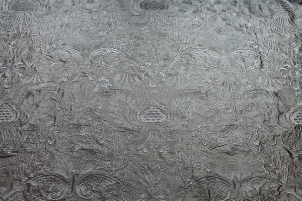 A beautiful silk dupion base in silver with a detailed jacquard style silver metallic embroidery.