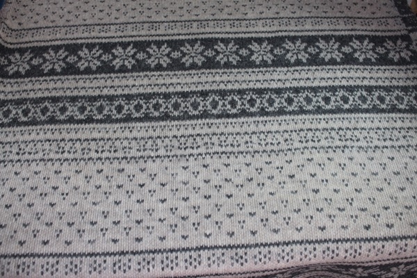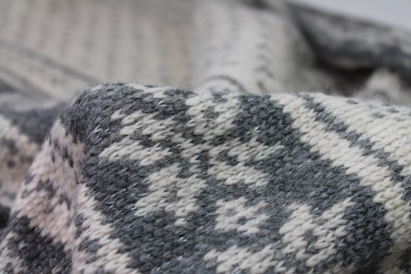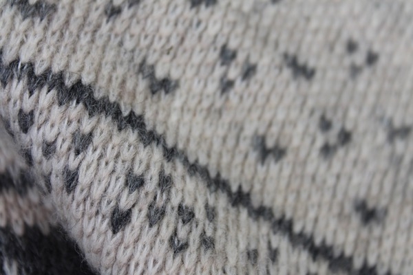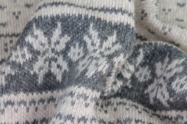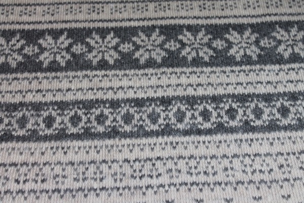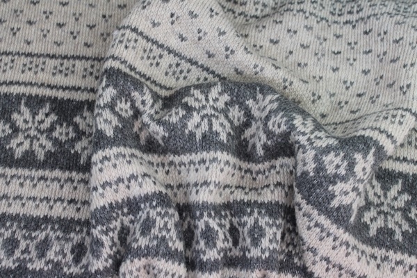 This is a thick knit in a pattern that resembles an Icelandic sweater, in mid grey and beige, great for jumpers, cardigans, scarves etc, even blankets or cushions.