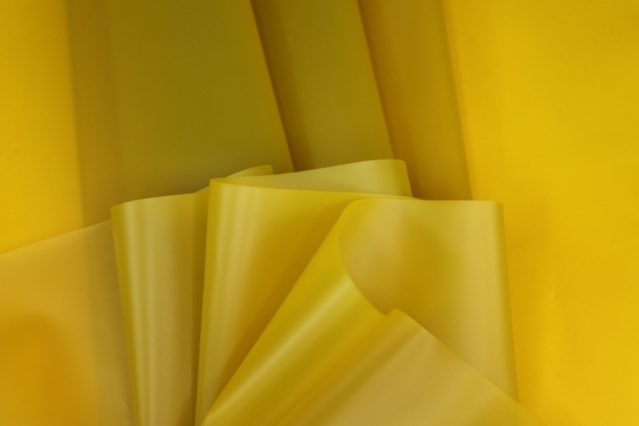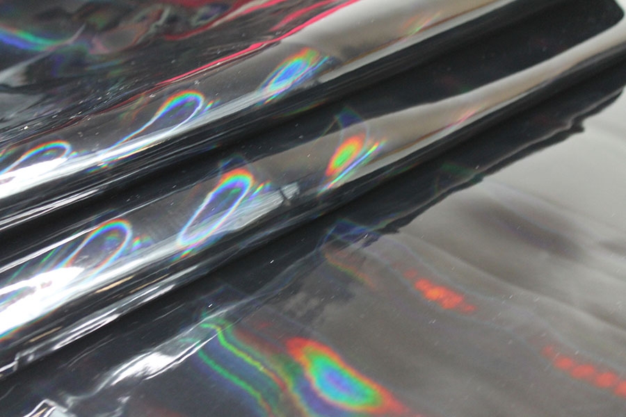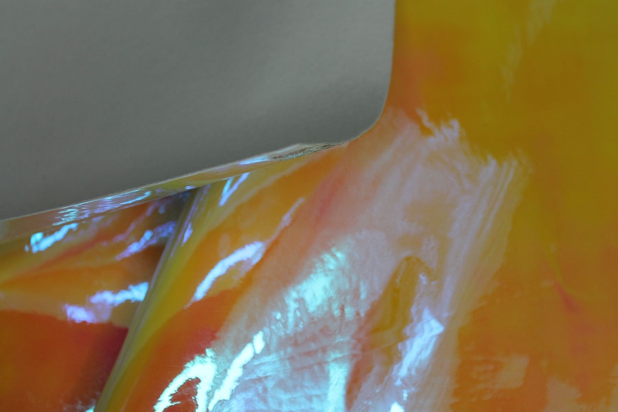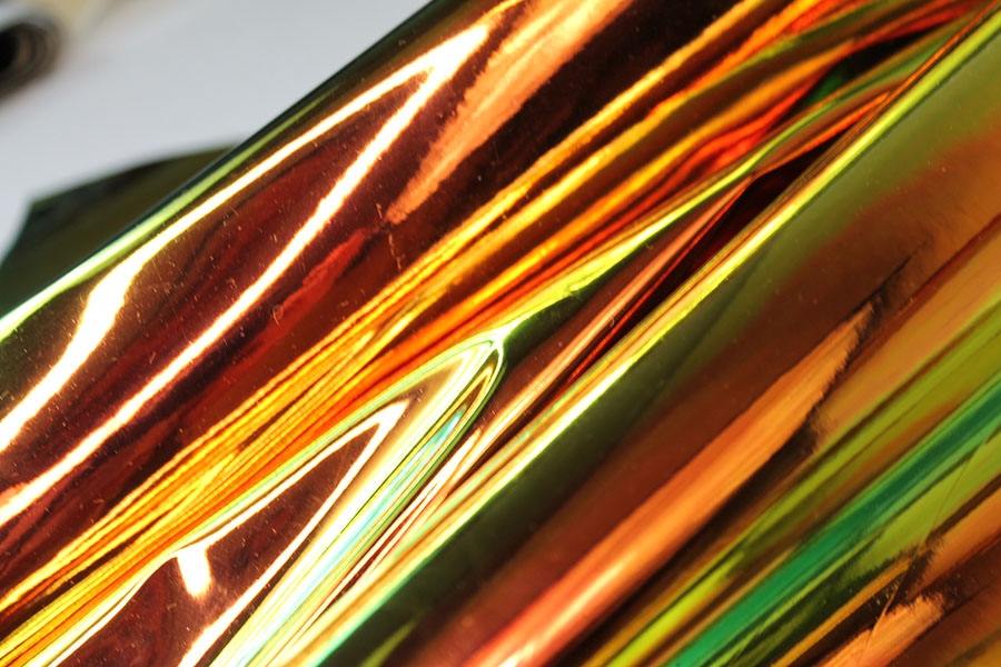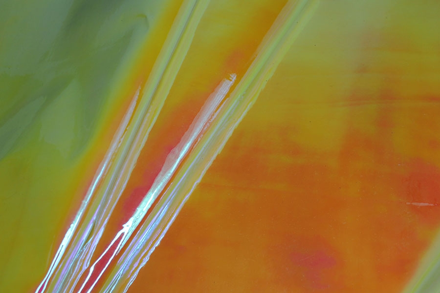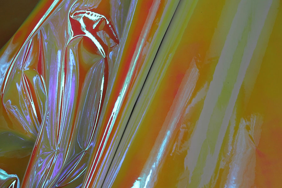 This fabulous iridescent mirror PVC changes colour from orange to yellow.