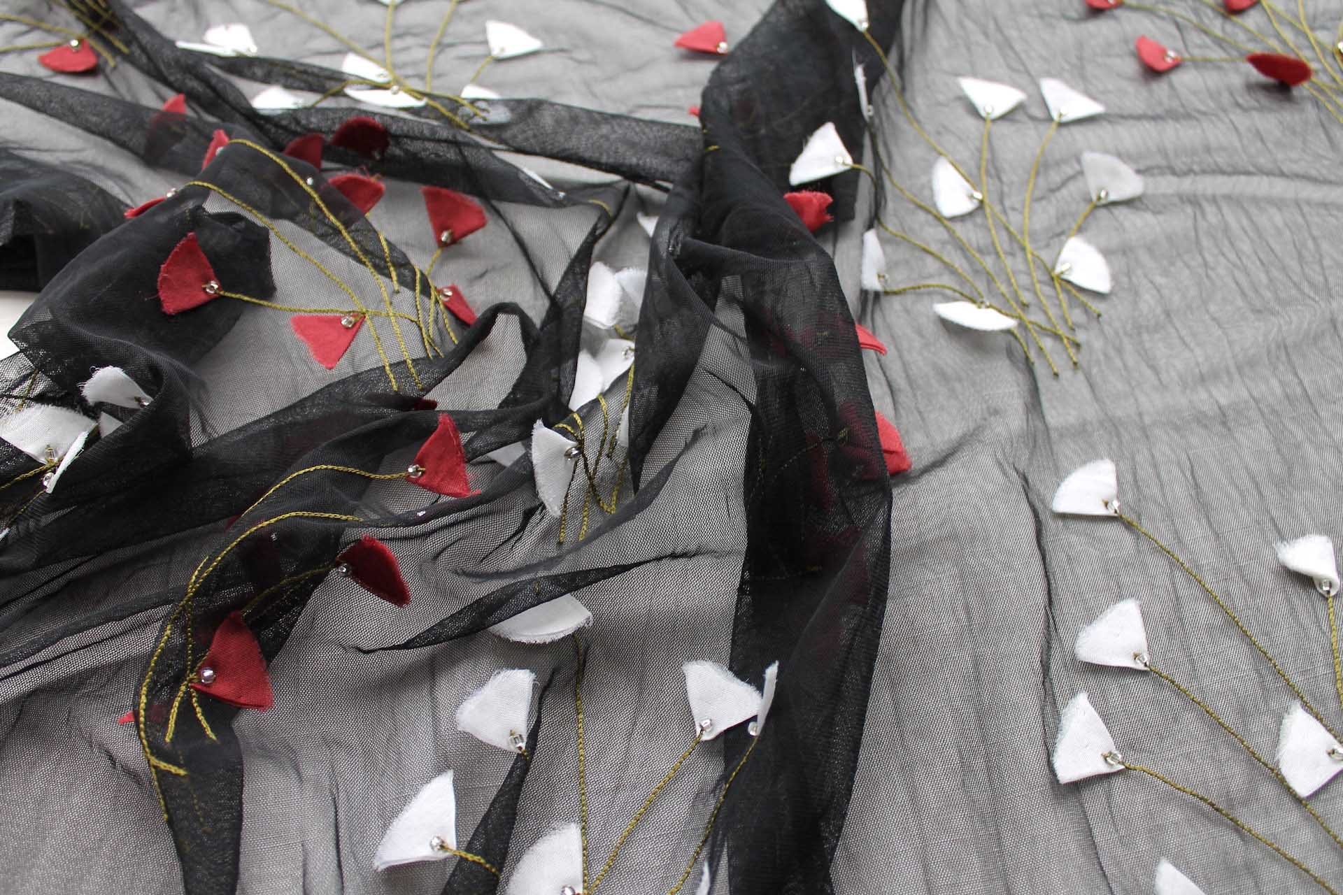 This black nylon tulle has had stylistic flowers embroidered and appliqueed onto it, ysing green thread for the stems, and folded up silk organza petals in ivory and burgundy, and then a few beads have been sewn on for a bit of twinkle.