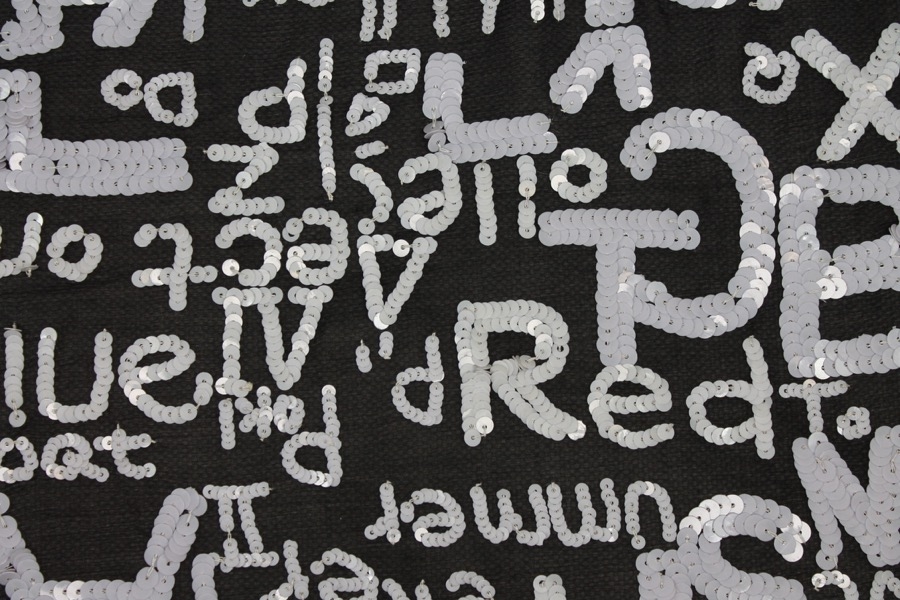 Black chiffon with lettering in assorted size from white round sequins.