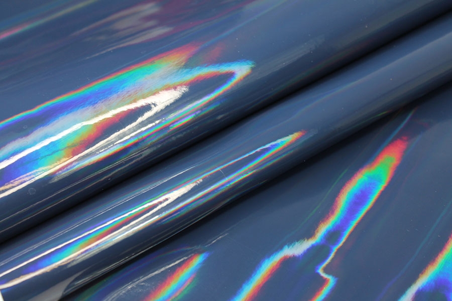 A European made glossy PVC in navy with a holographic iridescent sheen. A nice medium weight quality.
