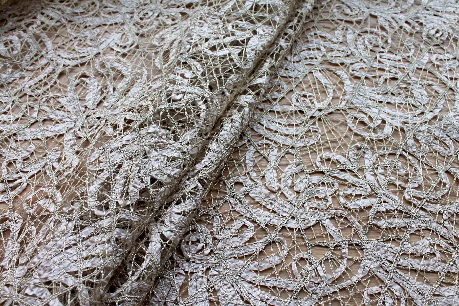 This is a French made embroidered ribbon mesh, where the ribbon has been embroidered onto a dissolvable base with gold thread, forming a floral type pattern. the dissolvable base has then been removed, leaving a mesh like fabric resembling lace. It does not feature scalloped edges.