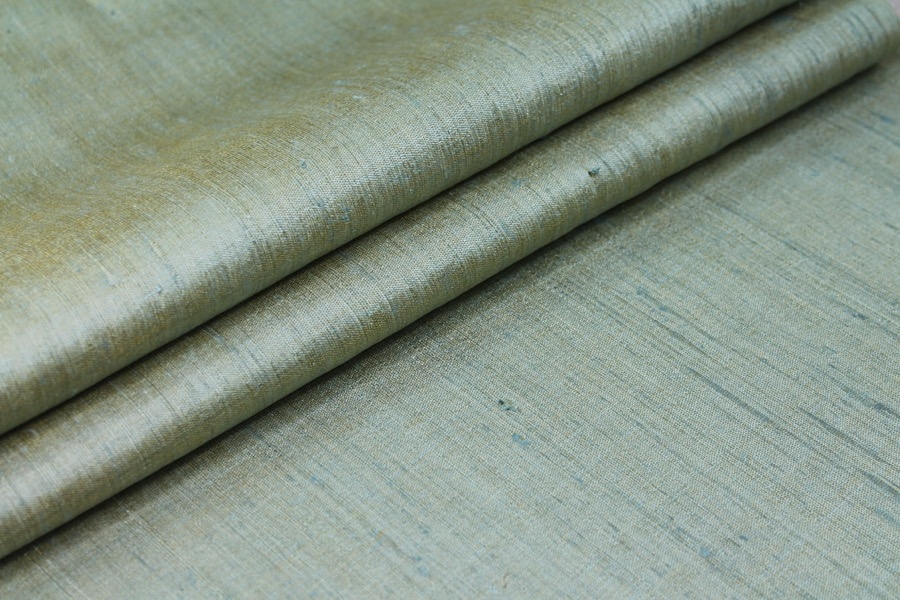 This is a beautifully textured silk tassar matka fabric with that "raw" appearance, woven with lime and beige thread with uneven finish, giving the classic characteristic of slub silk. It's firm but supple, with a slight dull sheen.