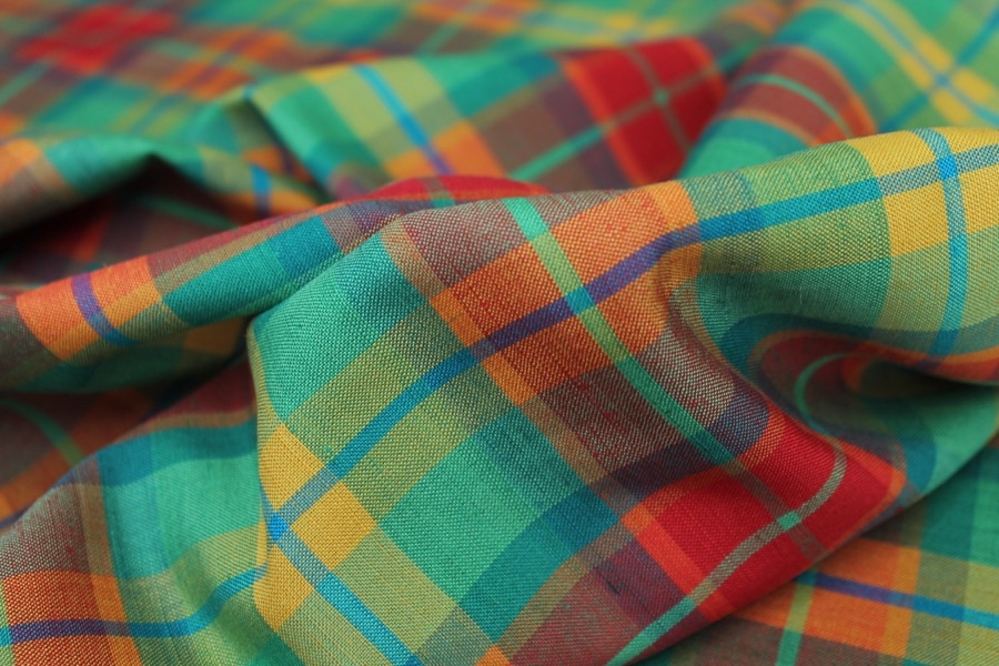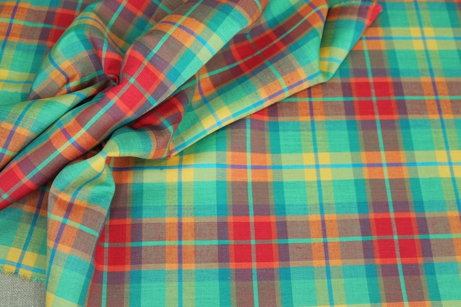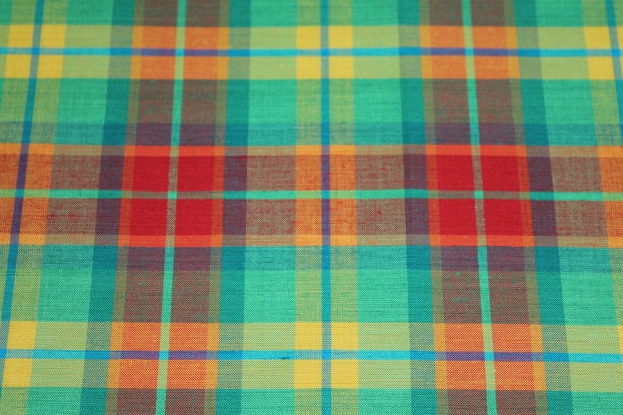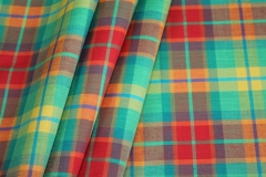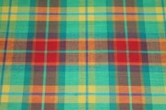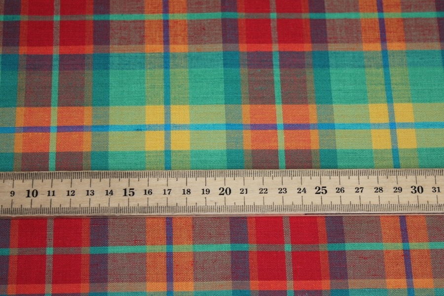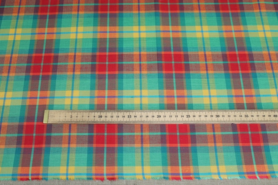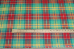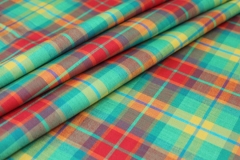 This is a woven tartan in linen, in a bright and colourful check combination of red, green, yellow and turquoise resulting in all the colours of the rainbow.
