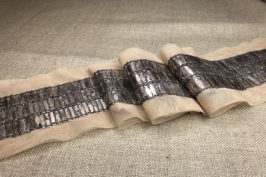 A nude coloured double layered tulle base with metal ellipse shaped sequins, metallic copper thread and a black and silver stitched edging.