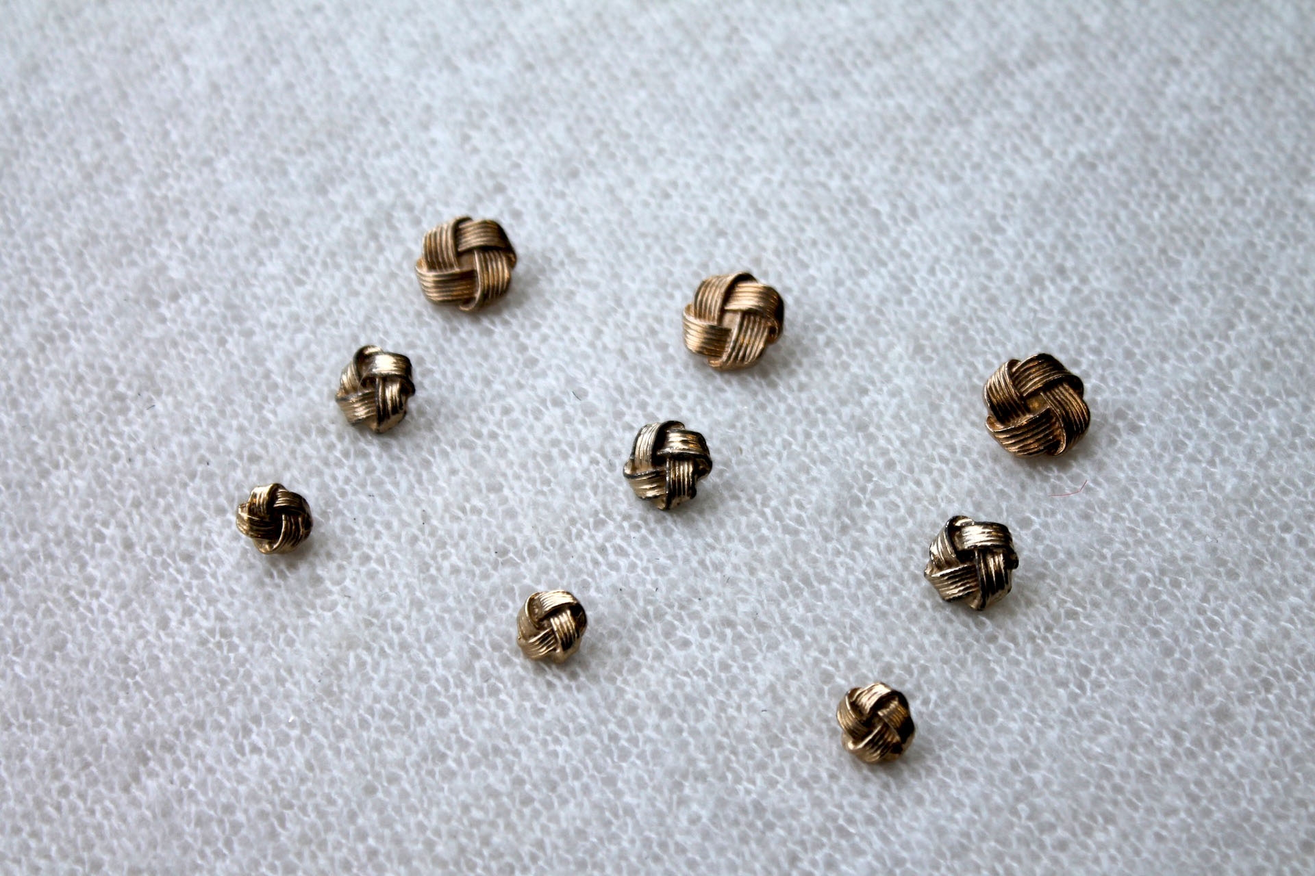Gold coloured vintage metal button in a knot design. Measures approx 1.2-1.4cm across.