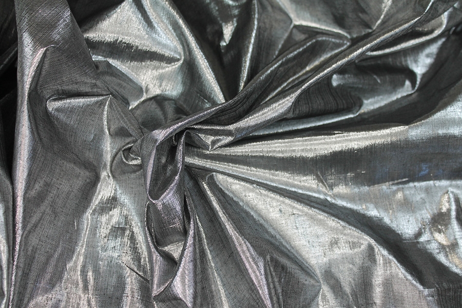 A beautifully structured cloth, woven with silver lurex thread and black polyester thread to give a high metallic sheen. Similar to a lamé, this one is 135-140cm.