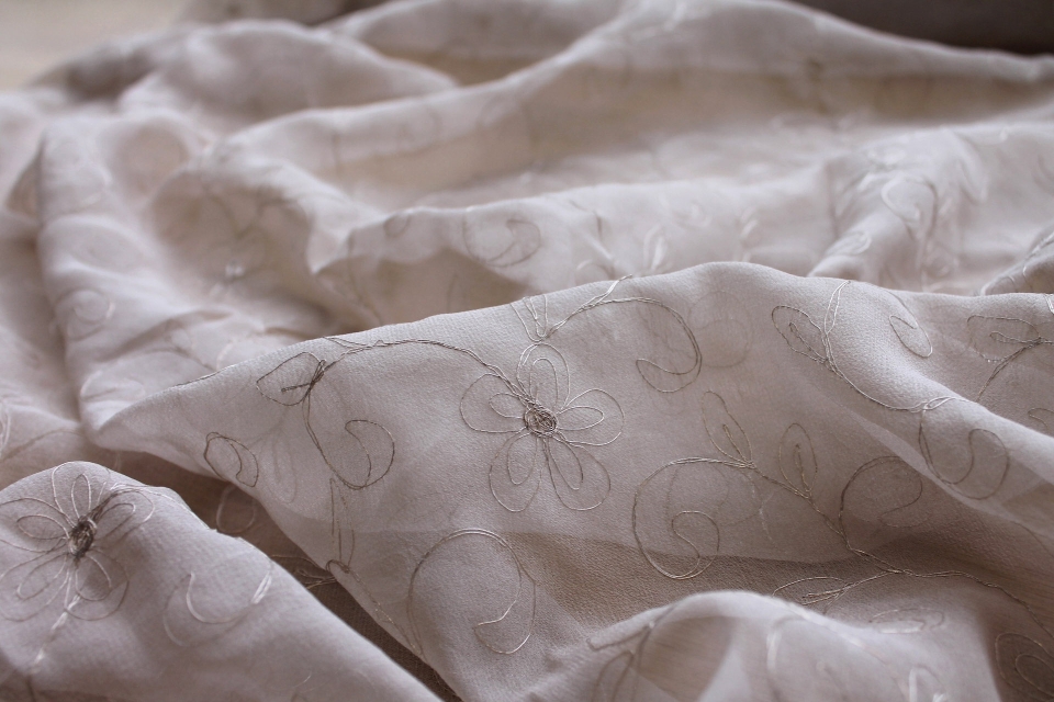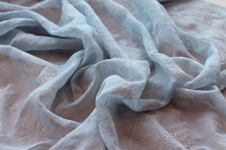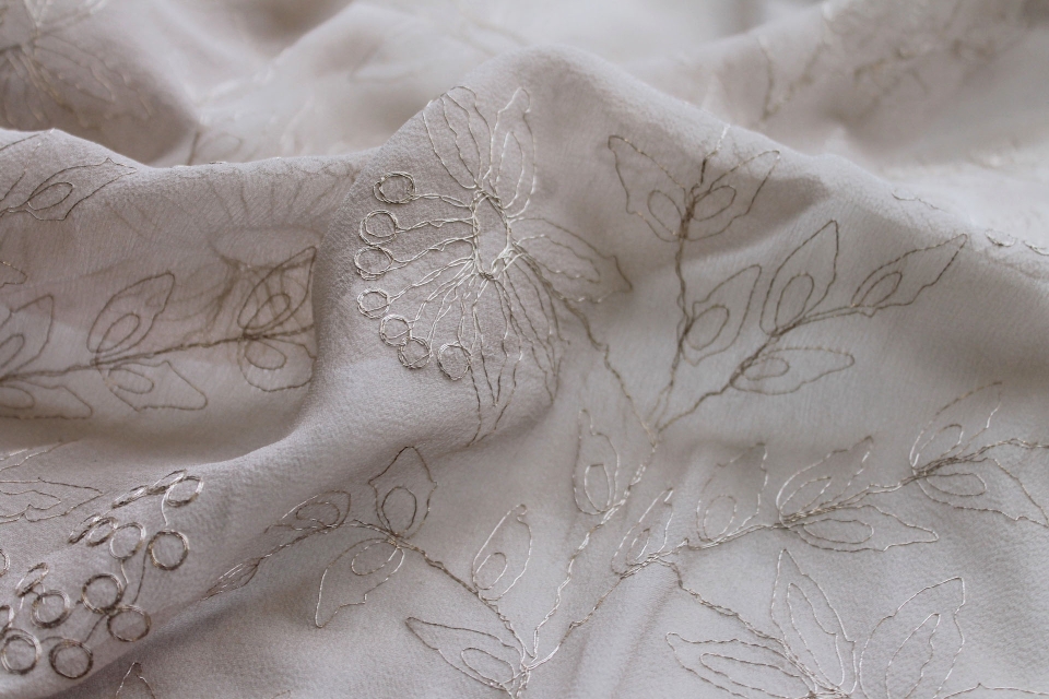 Grey silk chiffon embroidered in a floral pattern with fine silver metallic thread. The embroidery is very delicate and resembles scribbles with a silver quill.