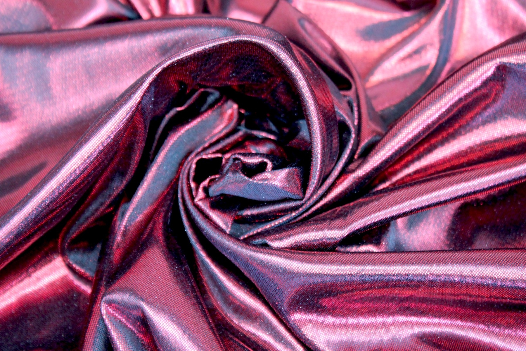 This is an inexpensive foiled nylon jersey in black with a metallic red foil finish in a tiny dot pattern. It has great drape but isn't extremely stretchy. 110cm wide, great for fancy dress.